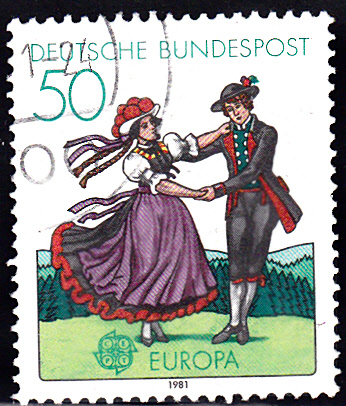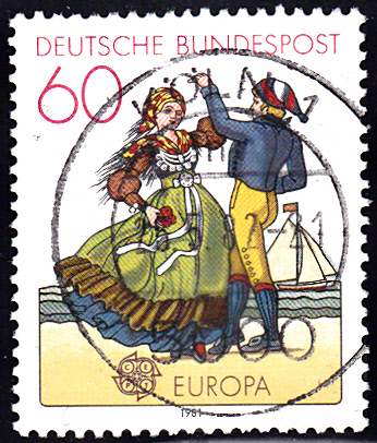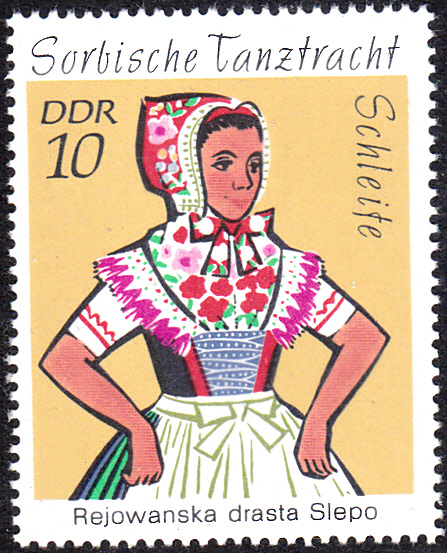 Auf einer der beiden Werte zu 8ß+40Pf (MiNr 1696) wird eine Tracht von Rügen (Mecklenburg-Vorpommern) vorgestellt. Hier halten die beiden Personen sogar noch je eine Kopfbedeckung in ihren Händen.