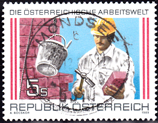 Auch dieser Bauarbeiter auf einer Marke aus Österreich (MiNr 1973) trägt einen Bauhelm.
