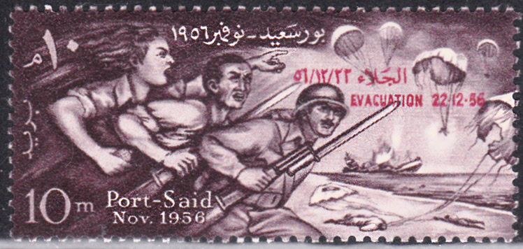 Die hier bereits gezeigte Marke aus Ägypten (vier Beiträge früher) wurde am 14. Januar 1957 aus Anlass des Abzuges der feindlichen Truppen aus Port Said auch mit einem rotem arabischem und französischem Aufdruck EVACUATION 22-12-56 ausgegeben (MiNr 498).