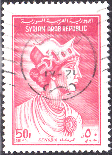 Auf dieser Luftpostmarke (MiNr 815) aus einer Serie von motivgleichen Marken Syriens wird Zenobia mit einer Kopfbedeckung gezeigt.