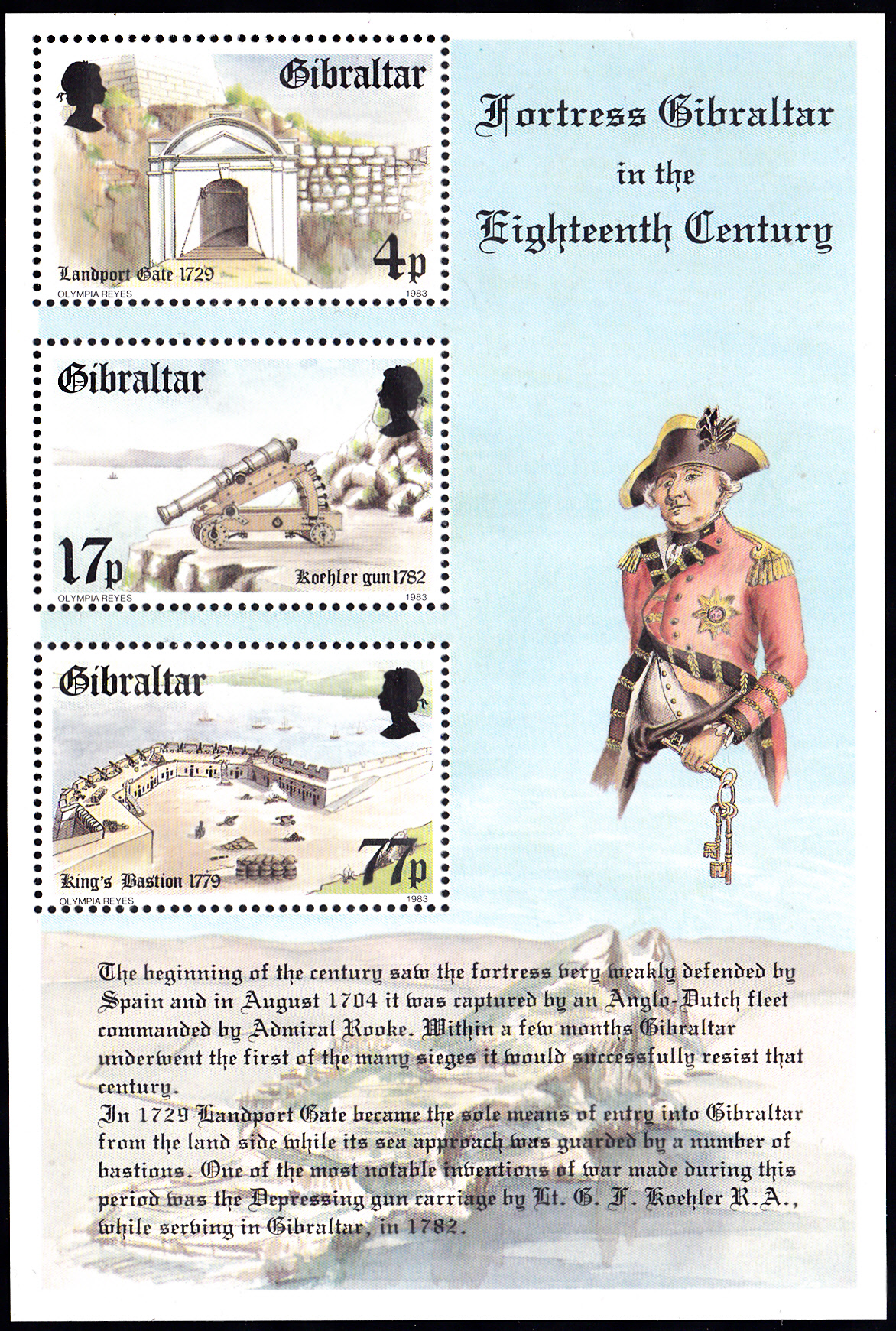 Die Kopfbedeckung des Mannes auf dem Block aus Gibraltar (MiNr Block 8) ist wohl auch der Kategorie "Dreispitz" zuzuordnen, obwohl die dritte "Ecke" nicht so klar ausgeprägt ist, wie bei den davor gezeigten Marken. Ende des 18. Jahrhunderts kam dann der "Zweispitz" in Mode. Dieses Modell ist vermutlich in der Übergangszeit vom Drei- zum Zweispitz entstanden.