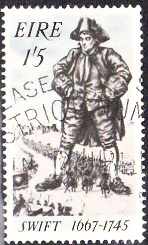 Diese Marke aus Irland (MiNr 201) zum 300. Geburtstag von Jonathan Swift (1667-1745; Theologe und Dichter) zeigt eine Darstellung zu "Gullivers Reisen". Gulliver trägt auf diesem Bild einen Dreispitz.