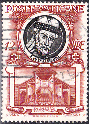 Auf dieser Marke aus dem Vatikan (MiNr 195) sehen wir Papst Silvester I. (gest. 335) mit seiner Mitra.