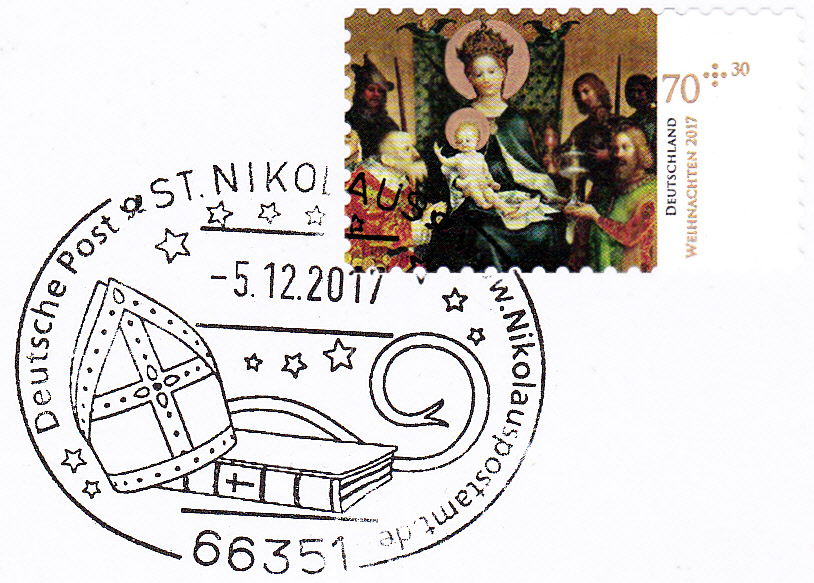 Im Sonderstempel aus St. Nikolaus vom 6.12.2017 wird auch eine Mitra geteigt.