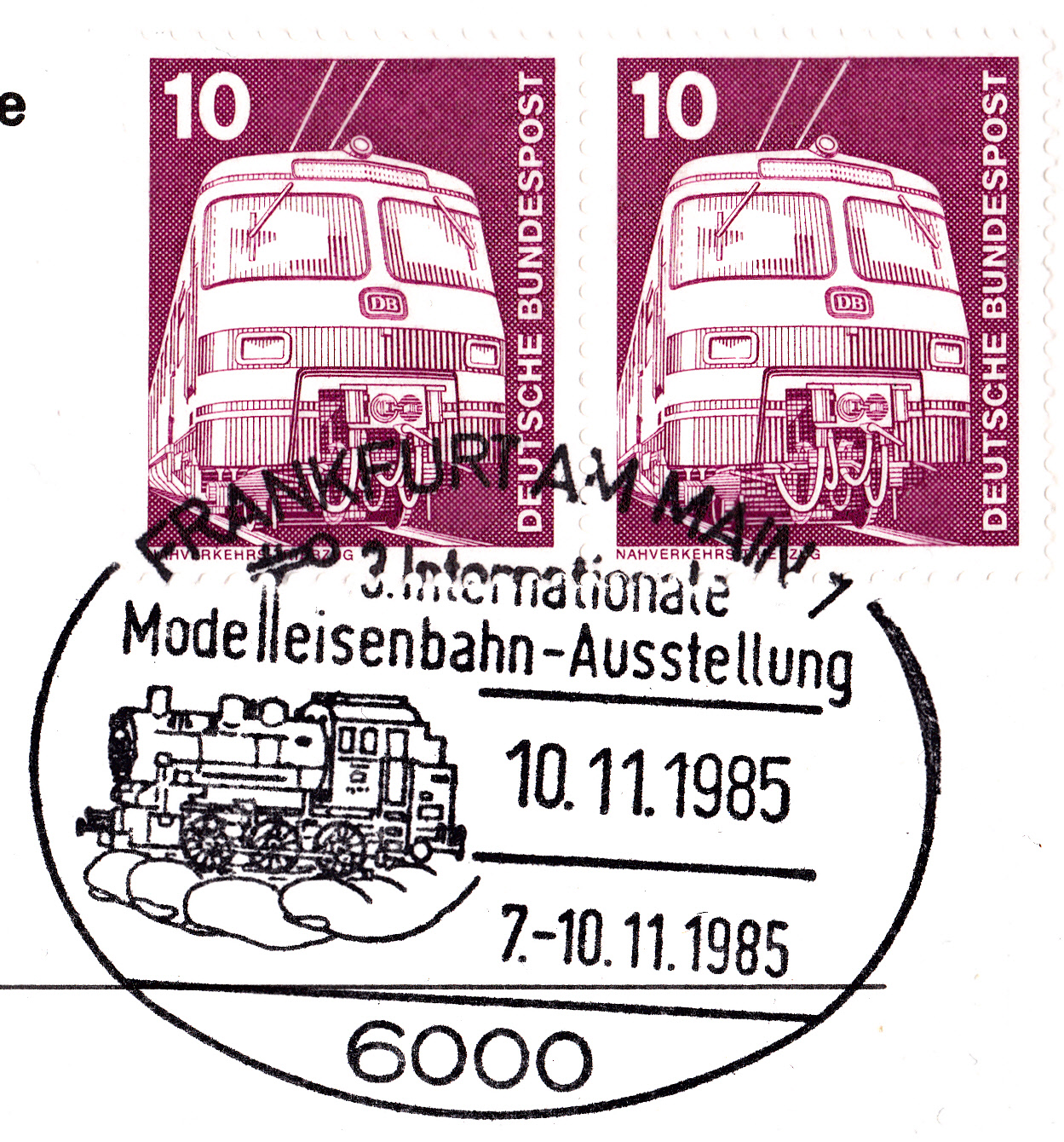 Sonderstempel vom 10.11.1985 aus Frankfurt am Main 1 zur 3. Internationalen Modelleisenbahn-Ausstellung. Im Stempelbild wird eine Hand mit einer Dampflok als Modelleisenbahn gezeigt.