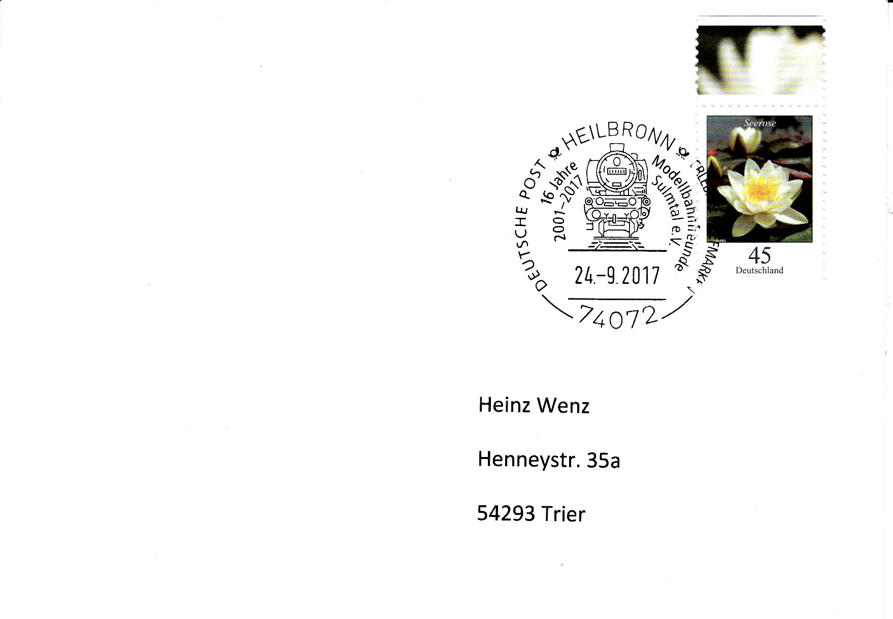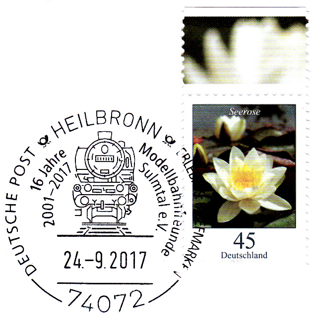 Dieser Sonderstempel vom 24.9.2017 aus Heilbronn feiert das ungewöhnliche Jubiläum "16 Jahre Modellbahnfreunde Sulmtal e.V.".