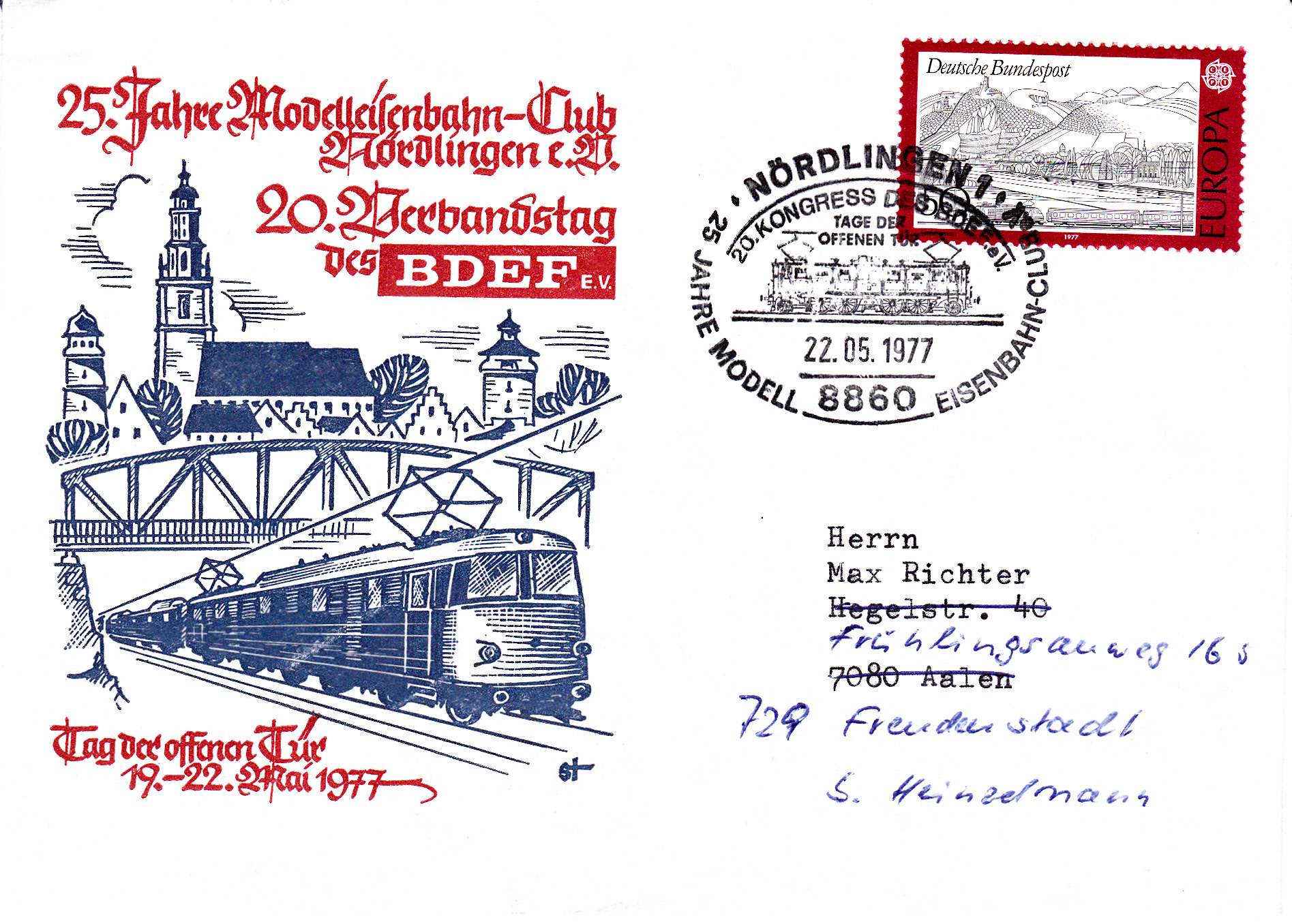 Sonderstempel vom 22.5.1977 aus Nördlingen zum Jubiläum "25 Jahre Modelleisenbahn-Club Nördlingen" und 20. Kongress des BDEF e.V.
