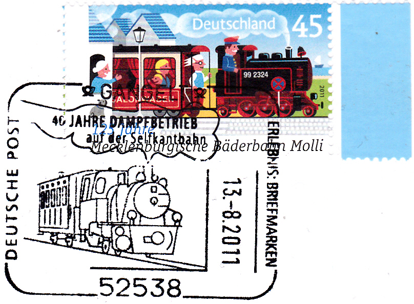 Sonderstempel aus Gangelt vom 13.8.2011 zum Thema "40 Jahre Dampfbetrieb auf der Selfkantbahn.
