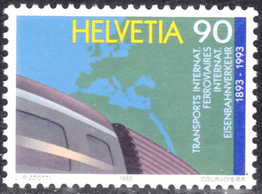 Zum Jubiläum "100 Jahre Zentralamt für den internationalen Eisenbahnverkehr (OCTI)" ist in der Schweiz diese Marke (MiNr 1488) mit einem Personen- und einem Güterzugwaggon vor der Landkarte von Eurasien und Nordafrika erschienen.