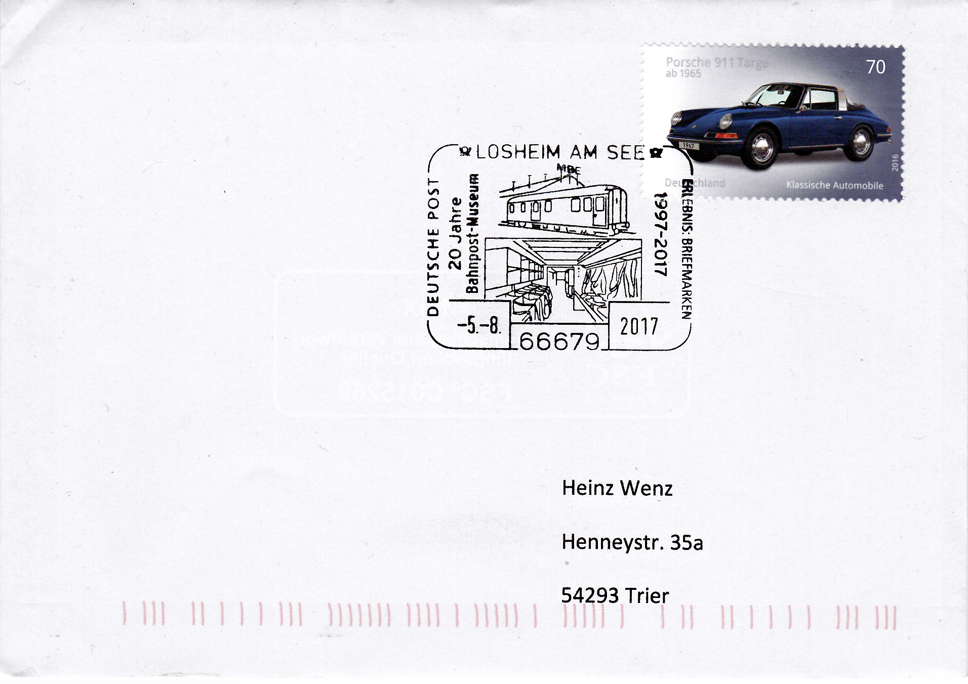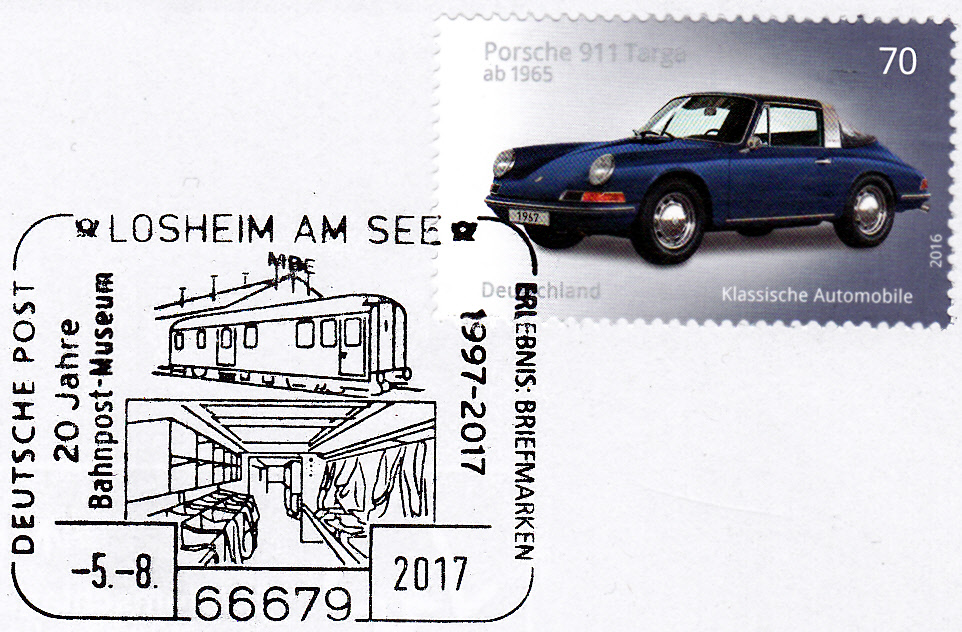 Sonderstempel vom 5.8.2017 aus Losheim zum Jubiläum "20 Jahre Bahnpost-Museum" mit einem Bahnpostwagen (oben) und einem Blick min das Innere eines Bahnpostwagen (unten) im Stempelbild.