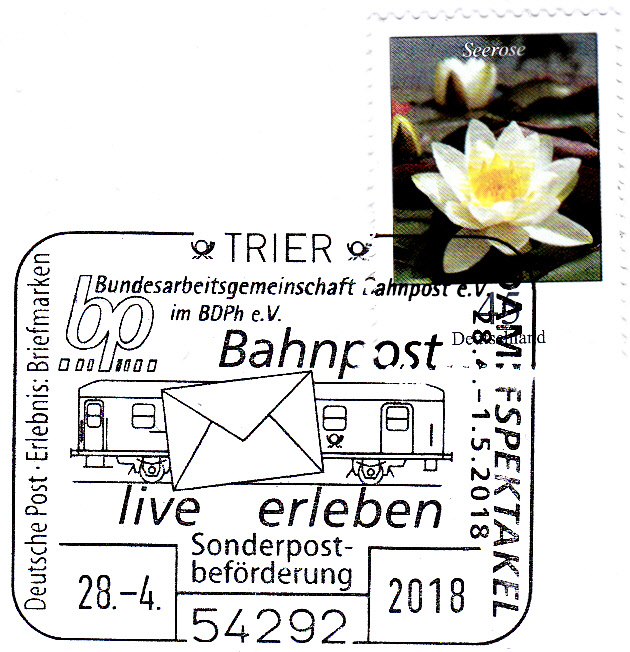 Sonderstempel vom 28.4.2018 aus Trier zum "Dampfspektakel" mit einem Bahnpostwagen im Stempelbild.