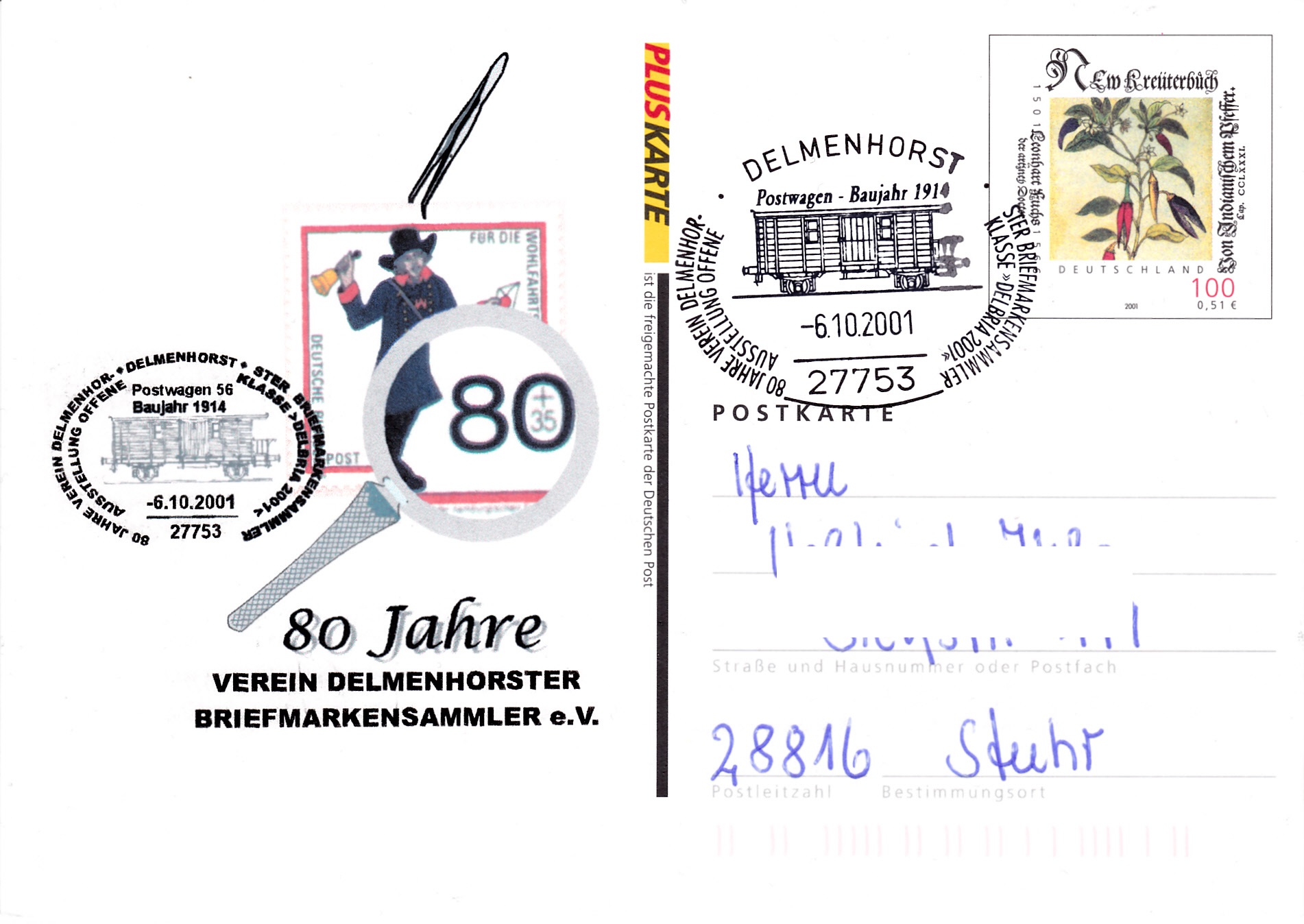 Pluskarte (MiNr PSo 77 II) mit einem Zudruck "80 Jahre Verein Delmenhorster Briefmarkensammler e.V." und dem dazu passenden Sonderstempel vom -6.10.2001 aus Delmemnhorst. Im Zudruck und im Sonderstempel wird jeweils ein Bahnpostwagen aus dem Jahre 1914 gezeigt.