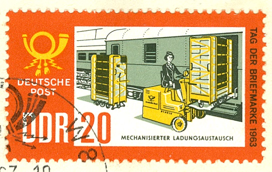 Der 20 Pfennig-Wert (MiNr. 999, mehrfarbig) der DDR-Ausgabe zum Tag der Briefmarke 1963 zeigt einen Bahnpostwagen, der gerade beladen wird.