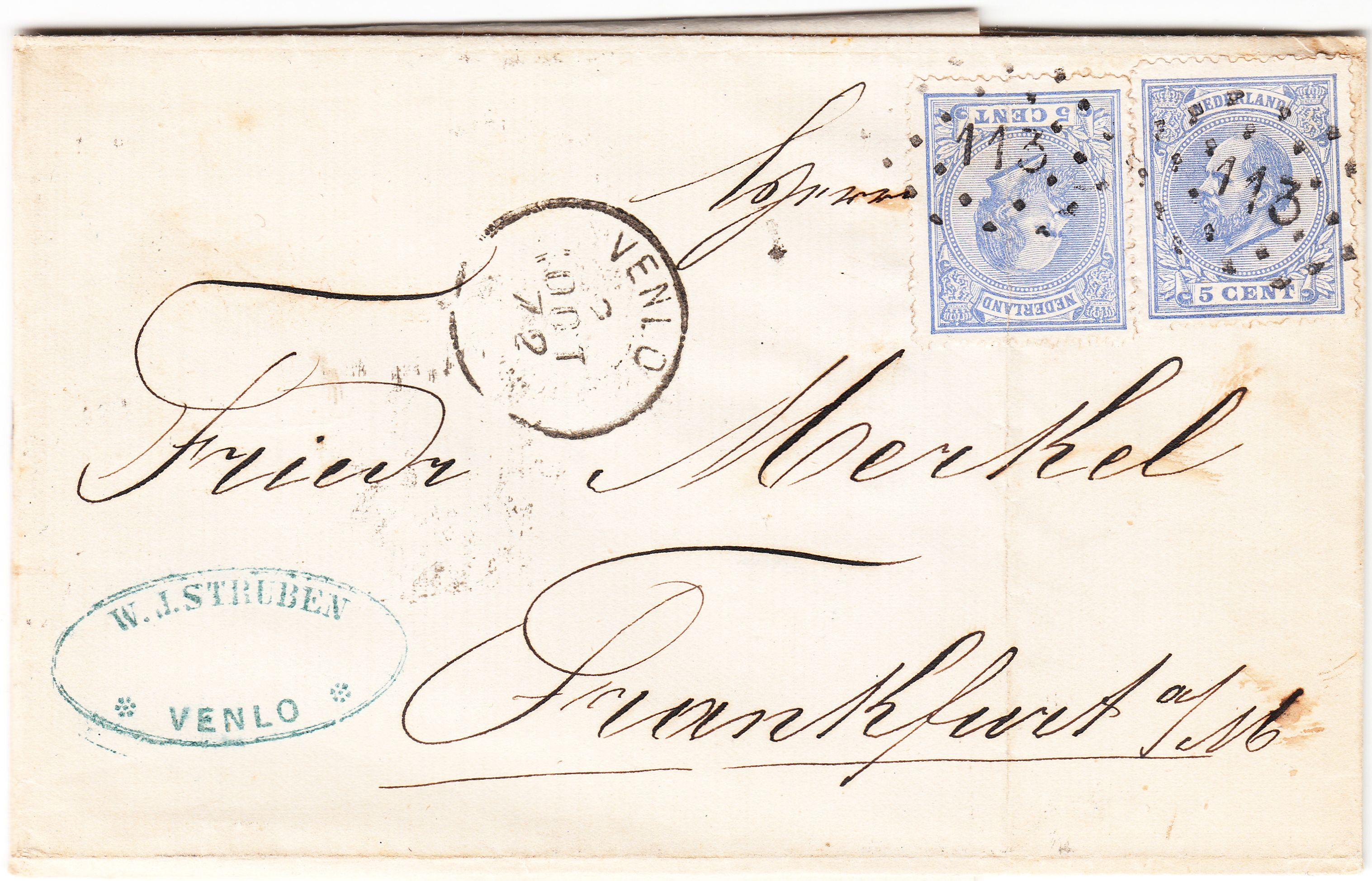 Dieser in Venlo in den Niederlanden am 02.10.1872 aufgegebene Brief ist adressiert nach Frankfurt am Main: