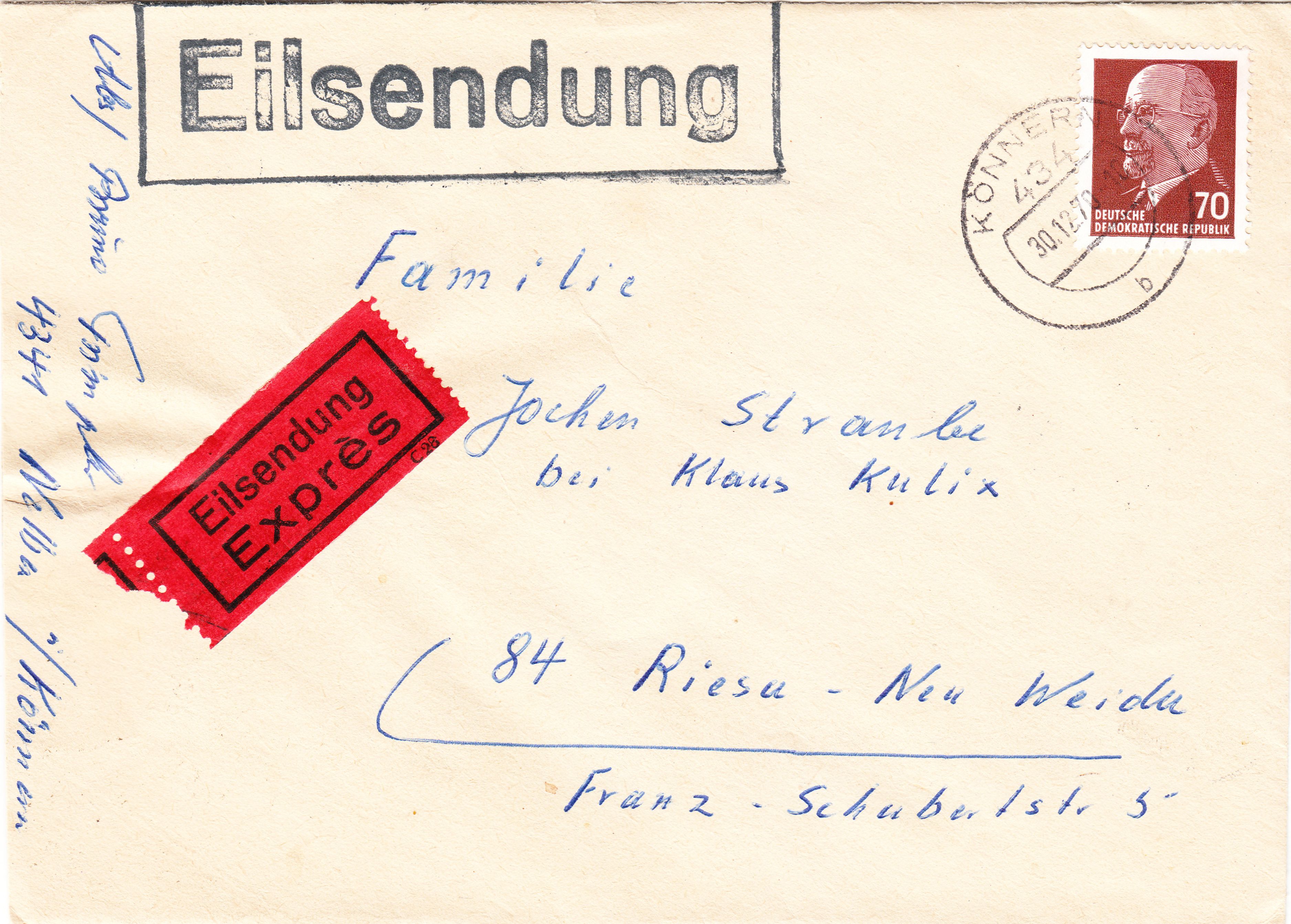 Hier ein solcher Eilbrief vom 30.12.1970, gelaufen innerhalb der DDR von Könnern nach Riesa: