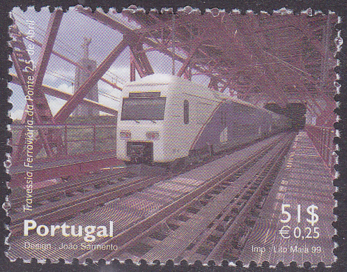 Zur Eröffnung der Eisenbahntrasse über die Tejo-Brücke in Lissabon erschien in Portugal eine Markenausgabe. Hier die Marke zu 51 Escudo / 0,25 € (MiNr 2358) mit einem Zug beim Überqueren die Tejo-Brücke.