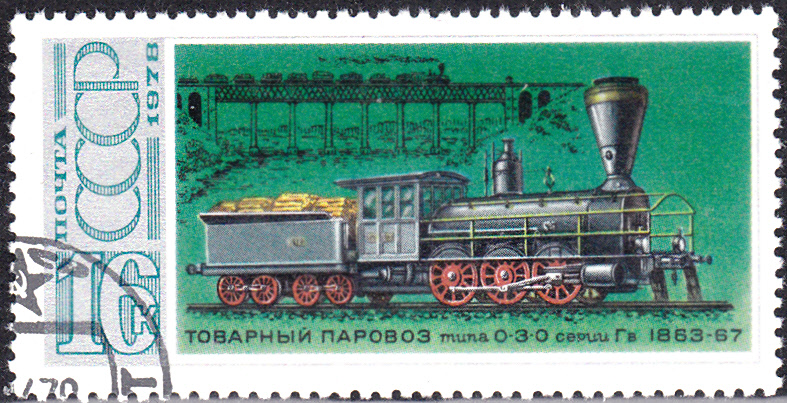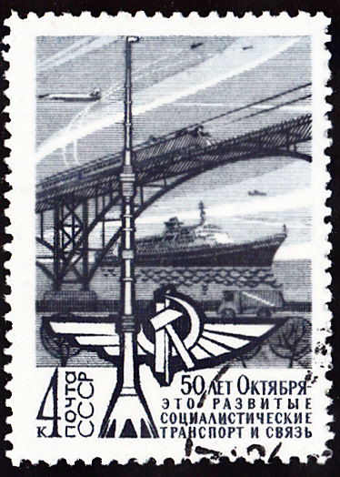 Hier eine Marke aus der Sowjetunion (MiNr 3435) zeigt einen Personenzug auf einer Stahlbrücke.