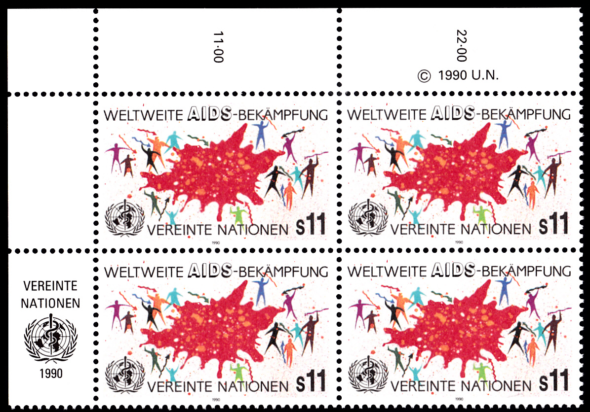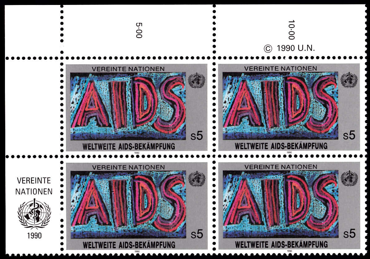 Bei der Postverwaltung der Vereinten Nationen Wien wurden 1990 Marken zur " Weltweiten Aidsbekämpfung" verausgabt. Hier zeige ich einen Eckrandviererblock der Marke zu 5 Schilling (MiNr 100) mit der Inschrift "Aids".