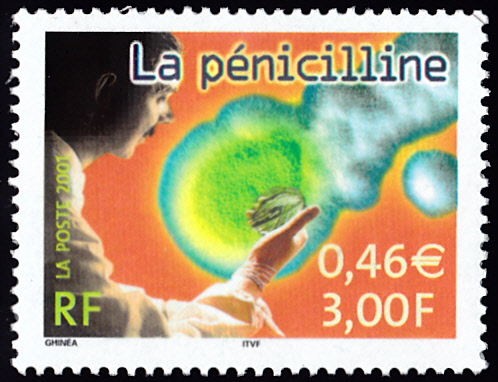In einer Serie "Wissenschaftliche Ereignisse im 20. Jahrhundert" ist in Frankreich auch diese Marke (MiNr 3565) zur Entdeckung des Penicillins mit der Abbildung eines Forschers mit Petrischale und ein Bakterium.