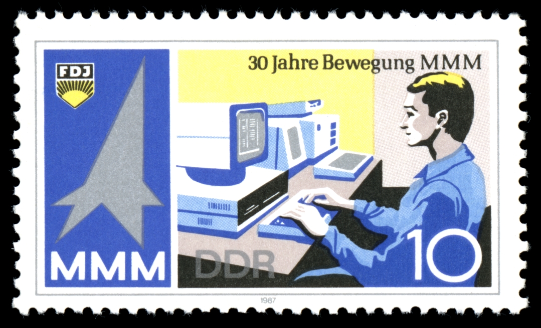 Dieses Postwertzeichen der DDR, MiNr. 3132, zeigt einen Jugendlichen am Personalcomputer 1715: