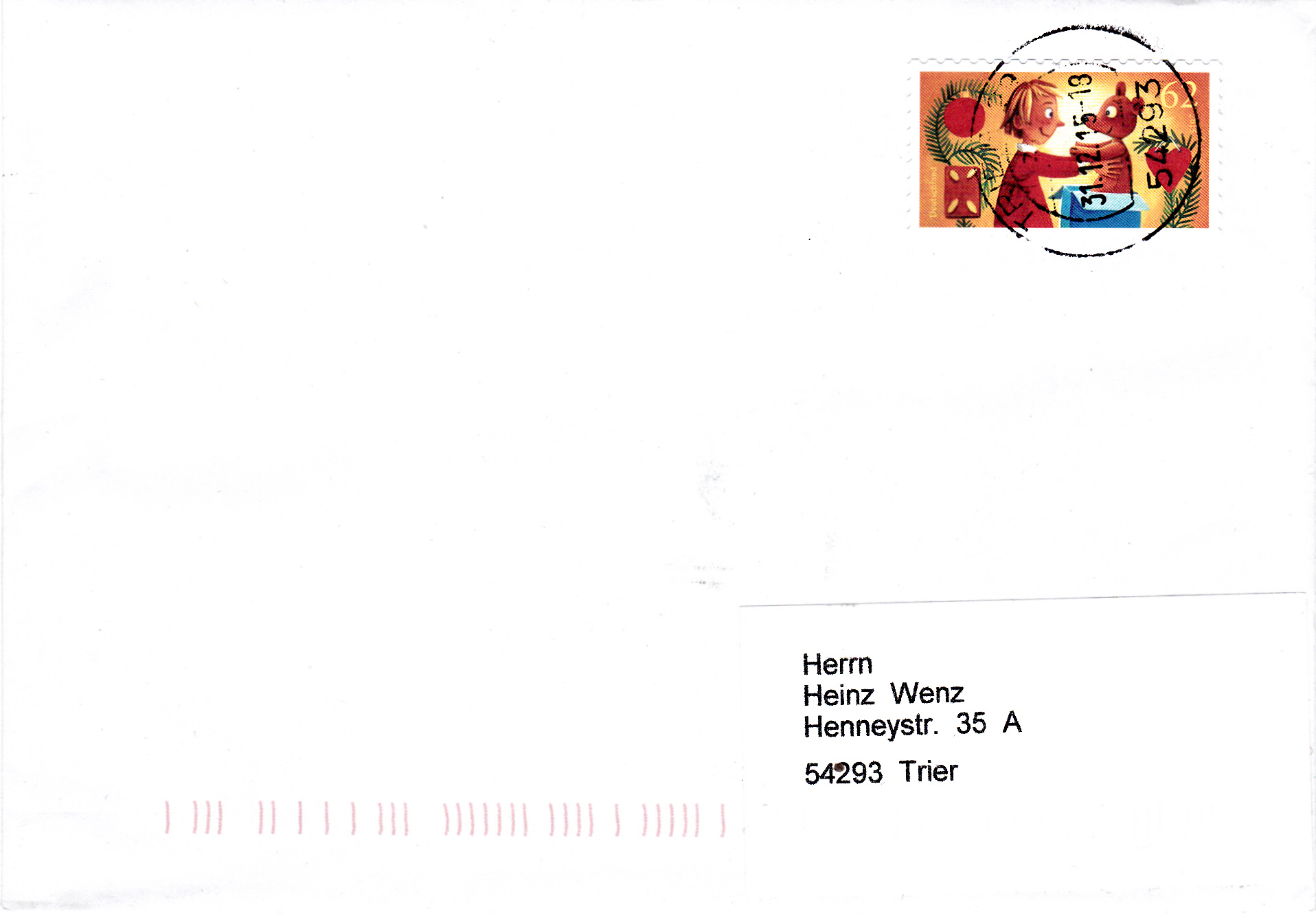 Die Marke zum Thema "Freude schenken" in der selbstklebenden Version (MiNr 3187), die einen Teddybär im Markenbild zeigt, wurde hier am letzten Tag der Portoperiode (31.12.2015) auf einem Standardbrief bis 20g benutzt.
