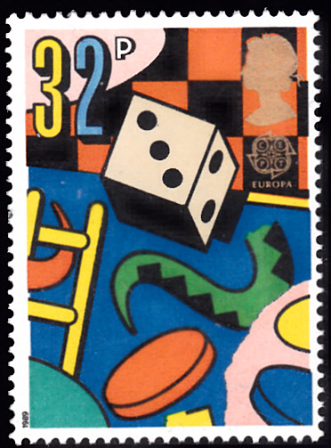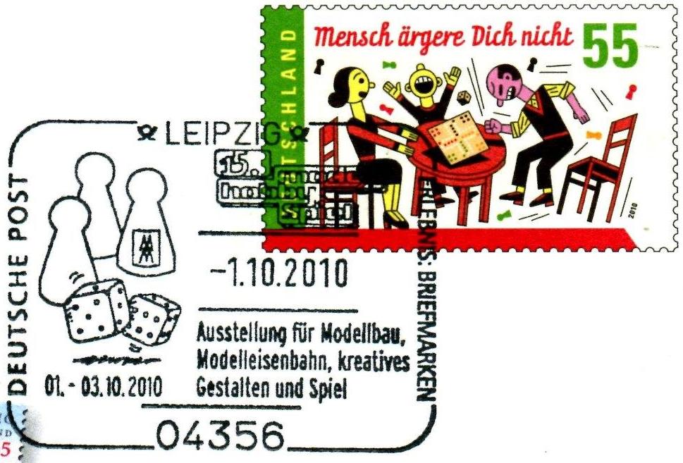 Hier noch der komplette Zusamendruck mit Ersttagsstempel. Auch im Stempel ist ein Ausschnitt des Spielbrettes zu sehen.