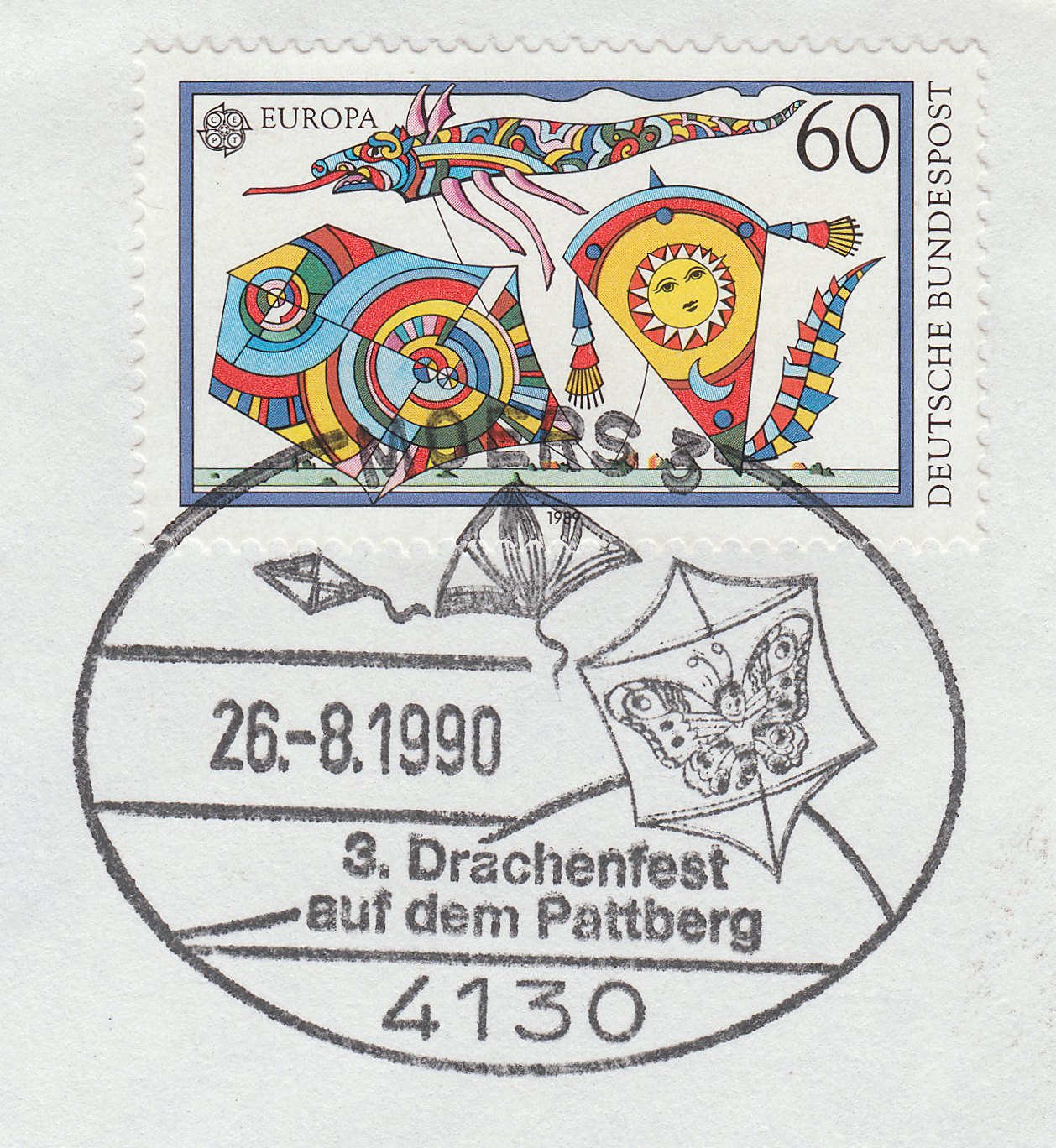 Durch diese Maßnahme entstand ein interessanter Beleg, der zum gewählten Thema Drachen ideal paßt, sich aber problemlos auch in eine Sammlung Schmetterlinge aufnehmen läßt.
