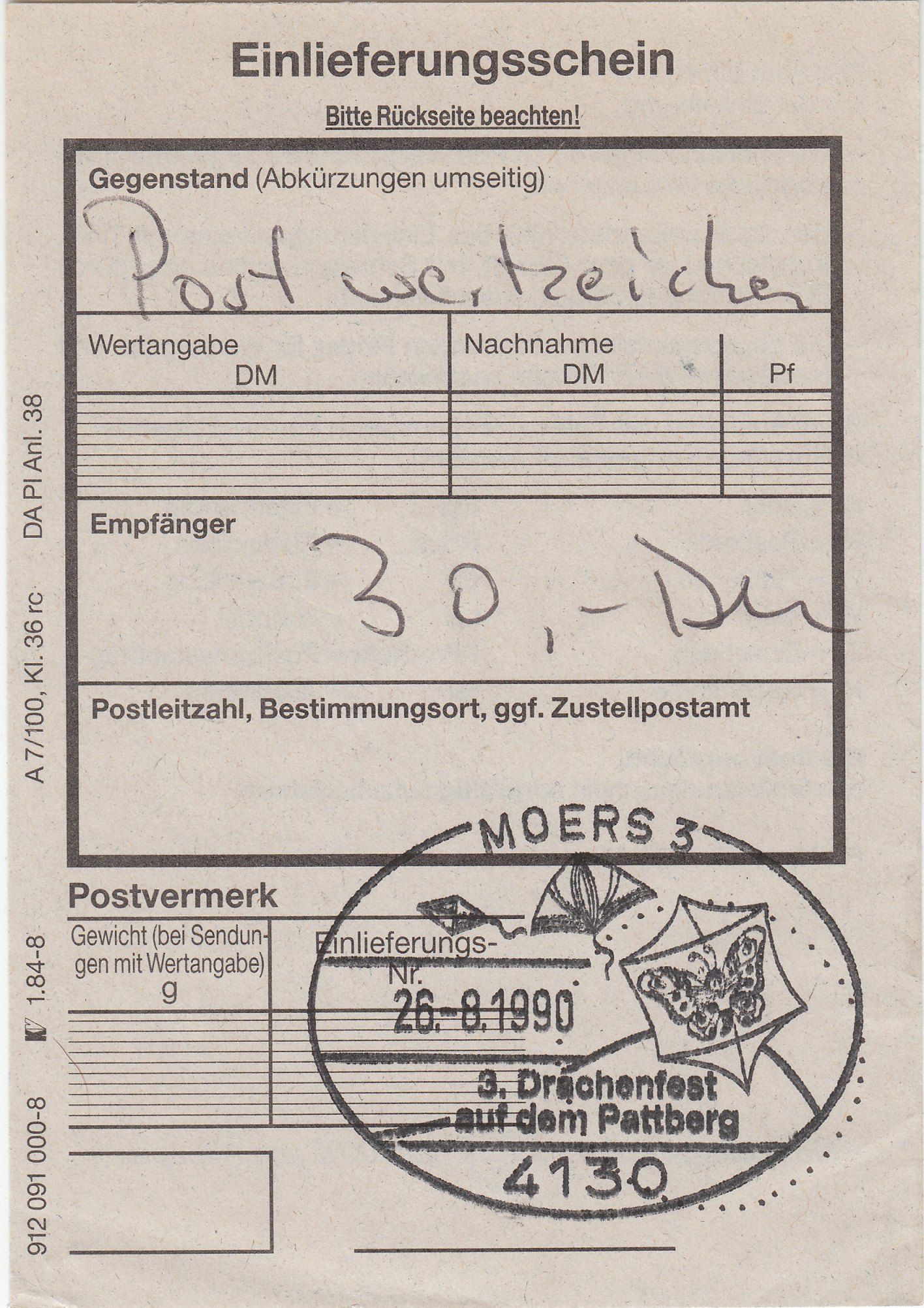 Hier hat ein Postkunde beim Sonderpostamt in Moers während des 3. Drachenfestes auf dem Pattberg am 26.08.1990 Postwertzeichen im Wert von 30 DM gekauft und eine Quittung dafür verlangt.