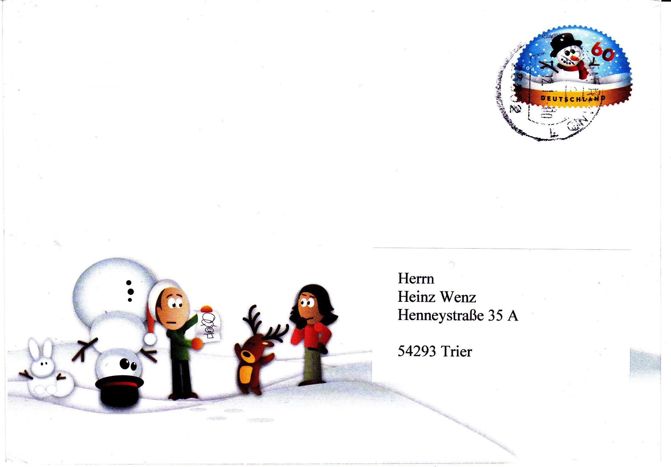 Die Deutsche Post verausgabte in einer Verkaufsverpackung Ganzsachenumschläge mit dem Werteindruck "Schneemann" und verkaufte diese zusammen mit jeweils einer Klappkarte über ihre Filialen. Hier eine der Ganzsachen echt gelaufen.