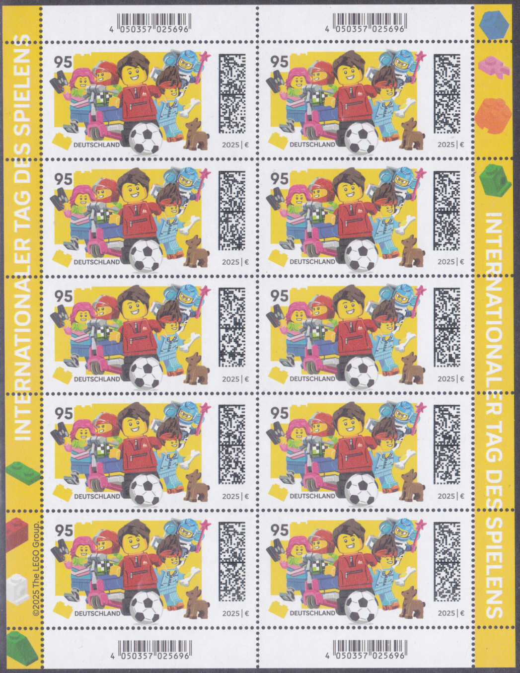 Zum Internationaler Tag des Spielens erschien 2025 bei der Deutschen Post eine Marke (MiNr 3912) zum Thema LEGO. Sie zeigt eine Gamerin mit Beinprothese, eine Scooterfahrerin mit Helm, einen Fußballspieler, eine Astronautin mit Zauberstab, einen Rollschuhfahrer mit Knochen, einen Hund als Spielfiguren des dänischen Spielzeugherstellers LEGO.
