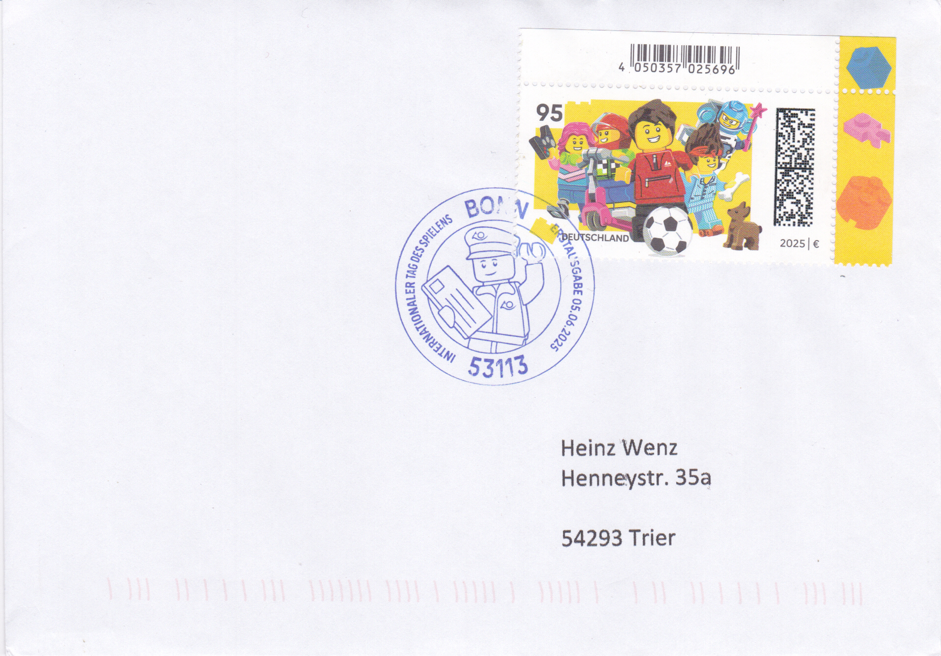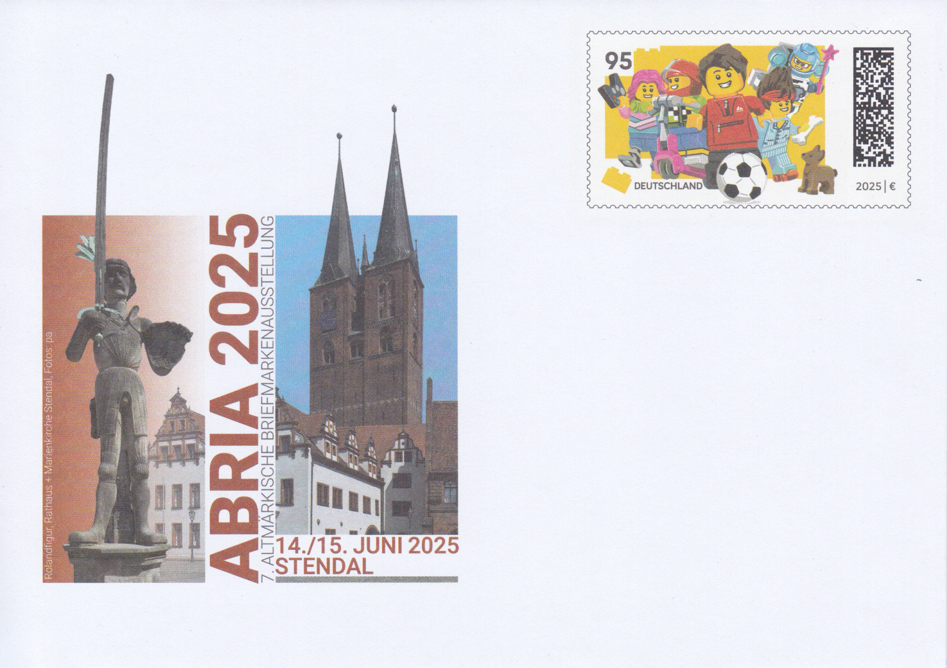 Zur Briefmarkenausstellung ABRIA 2025 in Stendal vom 14./15.6.2025 erschien bei der Deutschen Post eine Ganzsache mit dem Wertstempel im Muster der Marke zum Internationalen Tag des Spielens (MiNr 3912) zum Thema LEGO.