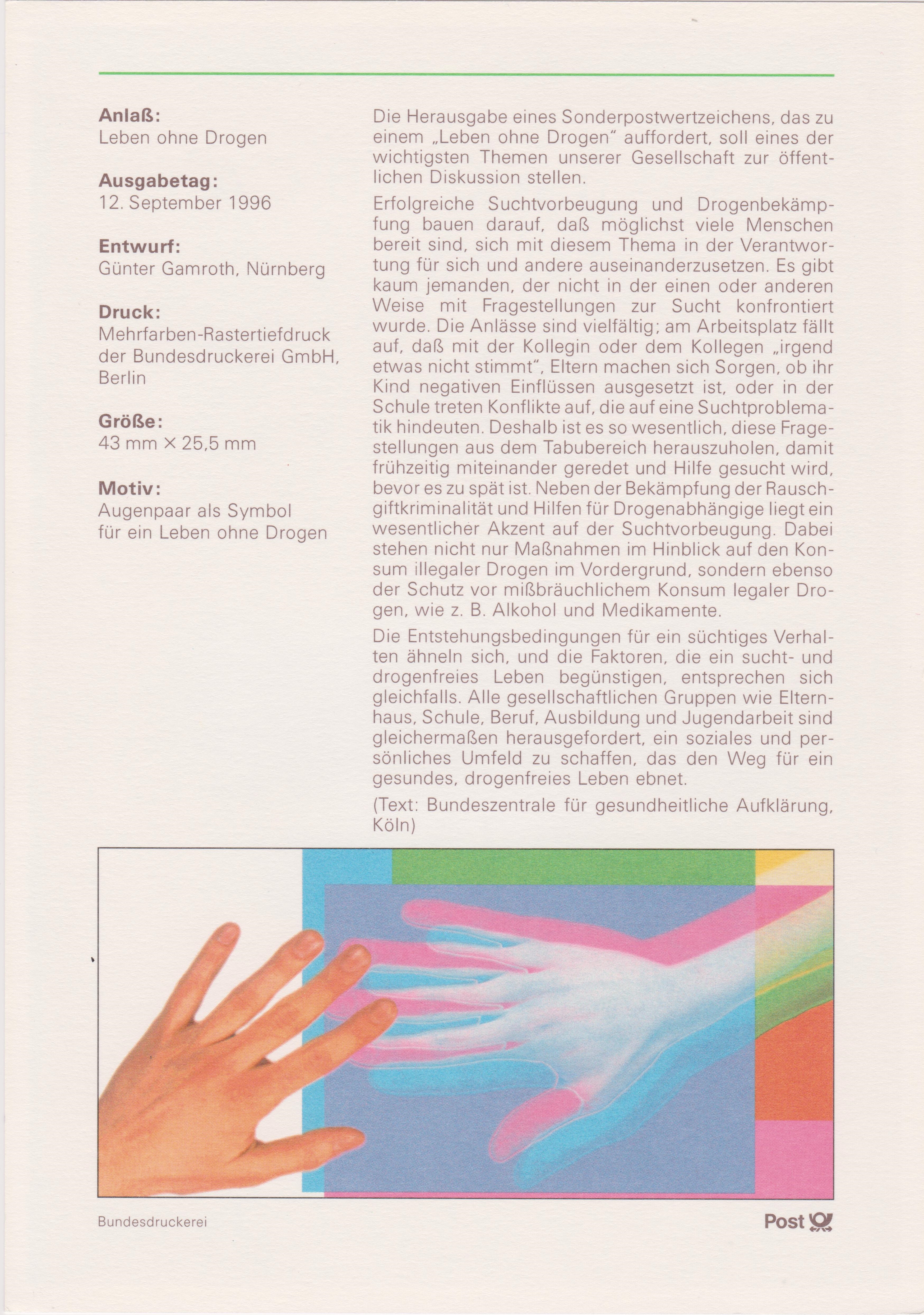 Klappkarte des Vorstandsvorsitzenden der Deutschen Post AG mit der Marke zur Kampagne gegen Drogenmissbrauch (MiNr 1882) und dem Ersttagsonderstempel Bonn.