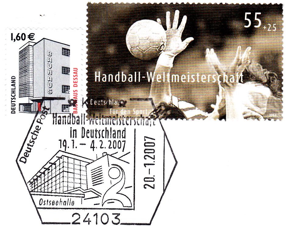 Einwurf-Einschreibebrief vom 19.1.2007 mit der Marke für die Handball-Weltmeisterschaft 2007 (MiNr 2578) und dem Sonderstempel aus Berlin zur Handball-WM 2007 mit dem Stempelbild "Max-Schmeling-Halle". In dieser Halle wurde das Eröffnungsspiel Deutschland– Brasilien 27 : 22 (12:10) am Fr, 19. Januar 2007 um 17:30 Uhr ausgetragen.