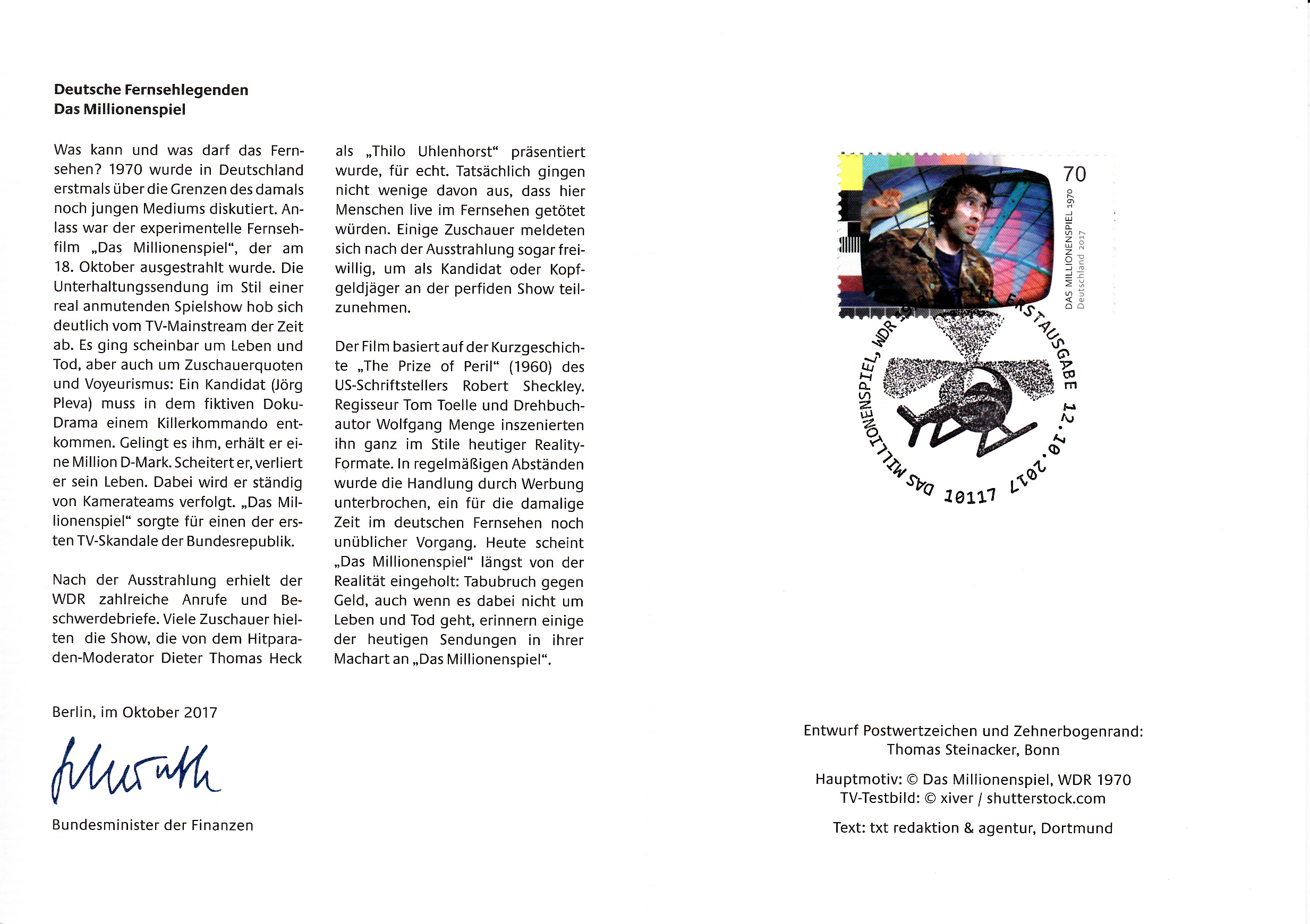 Bei der Deutschen Post AG ist am 12.10.2017 in der Serie "Deutsche Fernsehlegenden" eine Marke (MiNr 3335) zu "Das Millionenspiel" erschienen. Auf der Marke wird der Kandidat Bernhard Lotz auf der Flucht vor Auftragskillern nach einer Originalszene aus dem Fernsehfilm "Das Millionenspiel" mit Jörg Pleva aus dem Jahre 1970 gezeigt. Hier ein Eckrandstück mit EAN-Code: