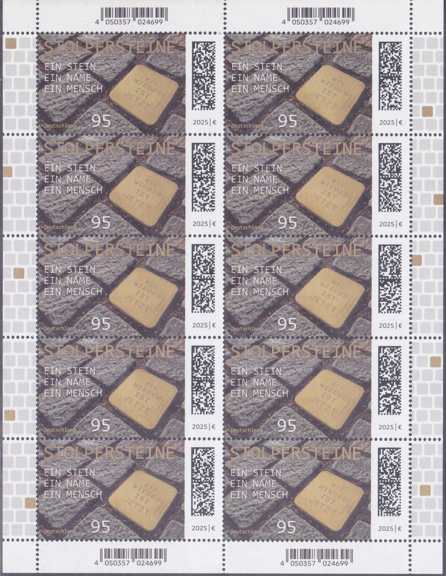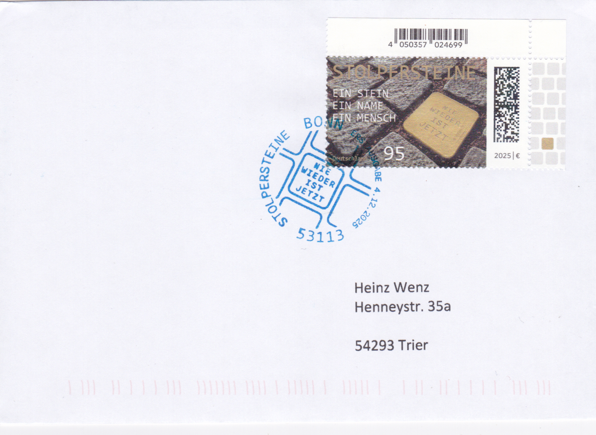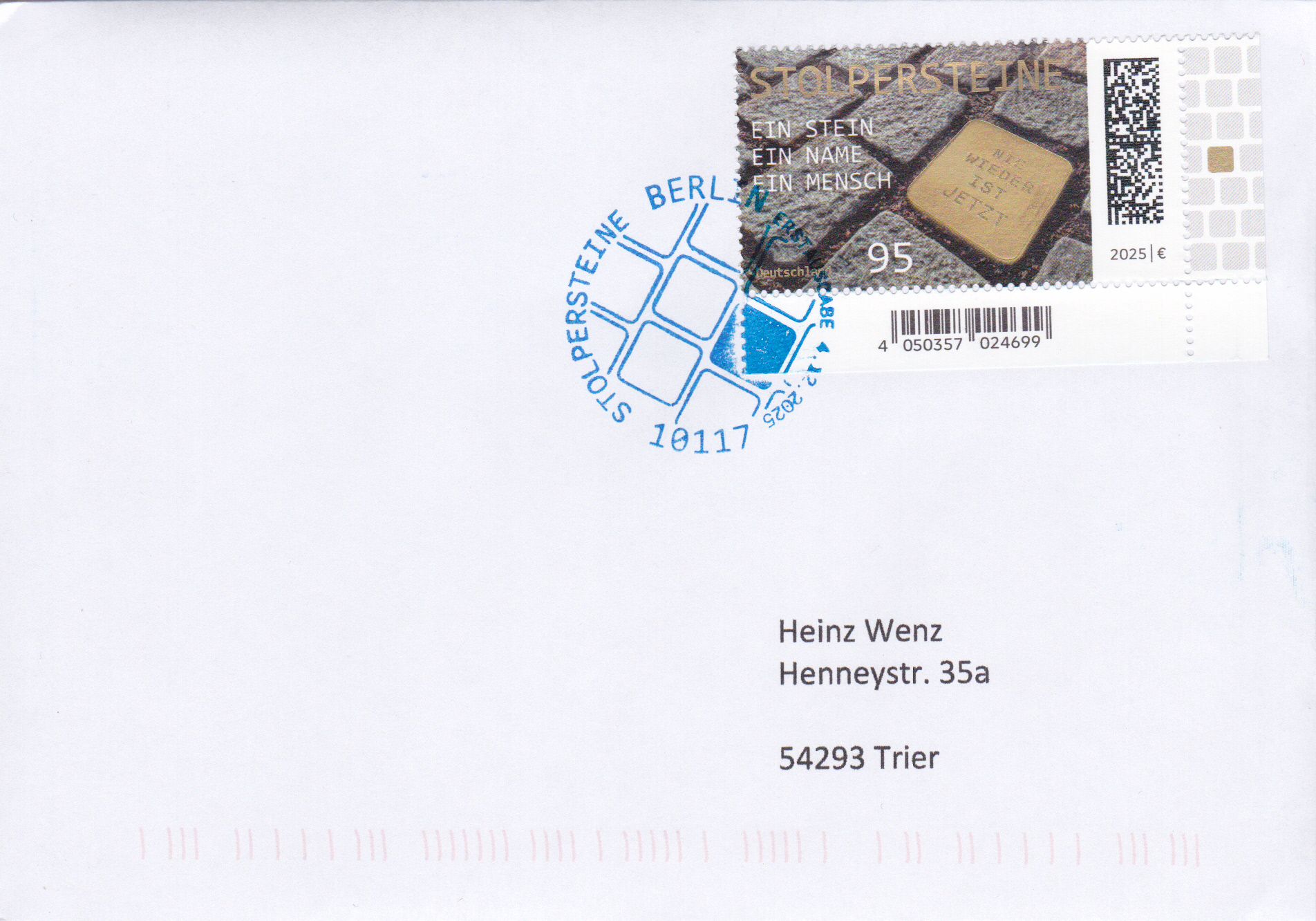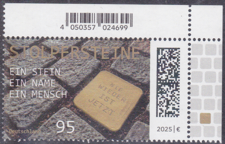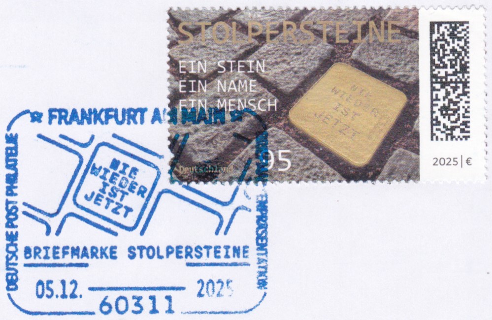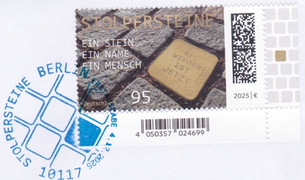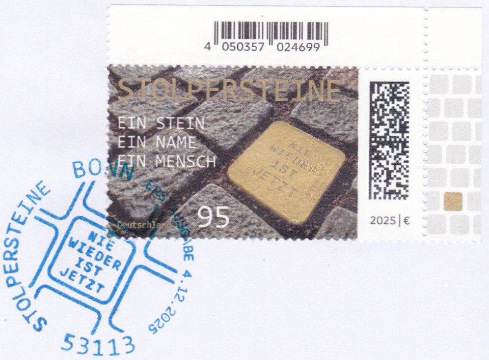 Bei der Deutschen erschien eine Marke (MiNr 3941) mit der Abbildung eines Kopfsteinpflaster und Messingstein mit der Inschrift "Nie wieder ist jetzt".