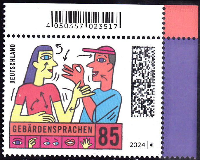 Bei der Deutschen Post erschien eine Marke zum Thema "Gebärdensprache" (MiNr 3819). Sie zeigt eine Frau und einen Mann, kommunizieren mittels Gebärdensprache kommunizieren. Hier zeige ich eine Marke vom Eckrand mit EAN-Codierung.