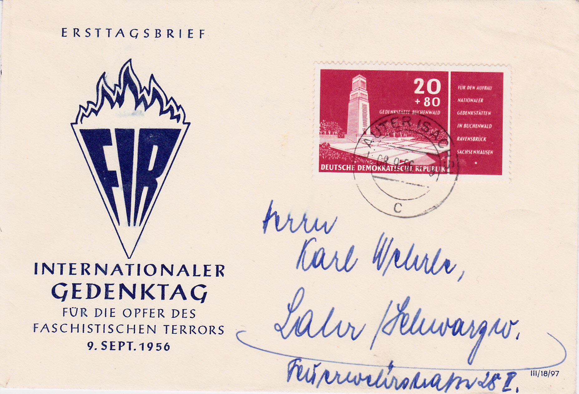 Die hier bereits gezeigte Marke (MiNr 538) mit Zuschlag zum Aufbau Nationaler Gedenkstätten mit dem Glockenturm der Gedenkstätte Buchenwald bei Weimar wurde hier am Ausgabetag auf einem Brief von Lauter (Sachs) nach Lahr/Schwarzwald als Frankatur verwendet.