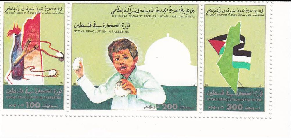 Die linke Marke dieses Zusamendrucks aus Libyen zeigt einen Molotowcocktail: