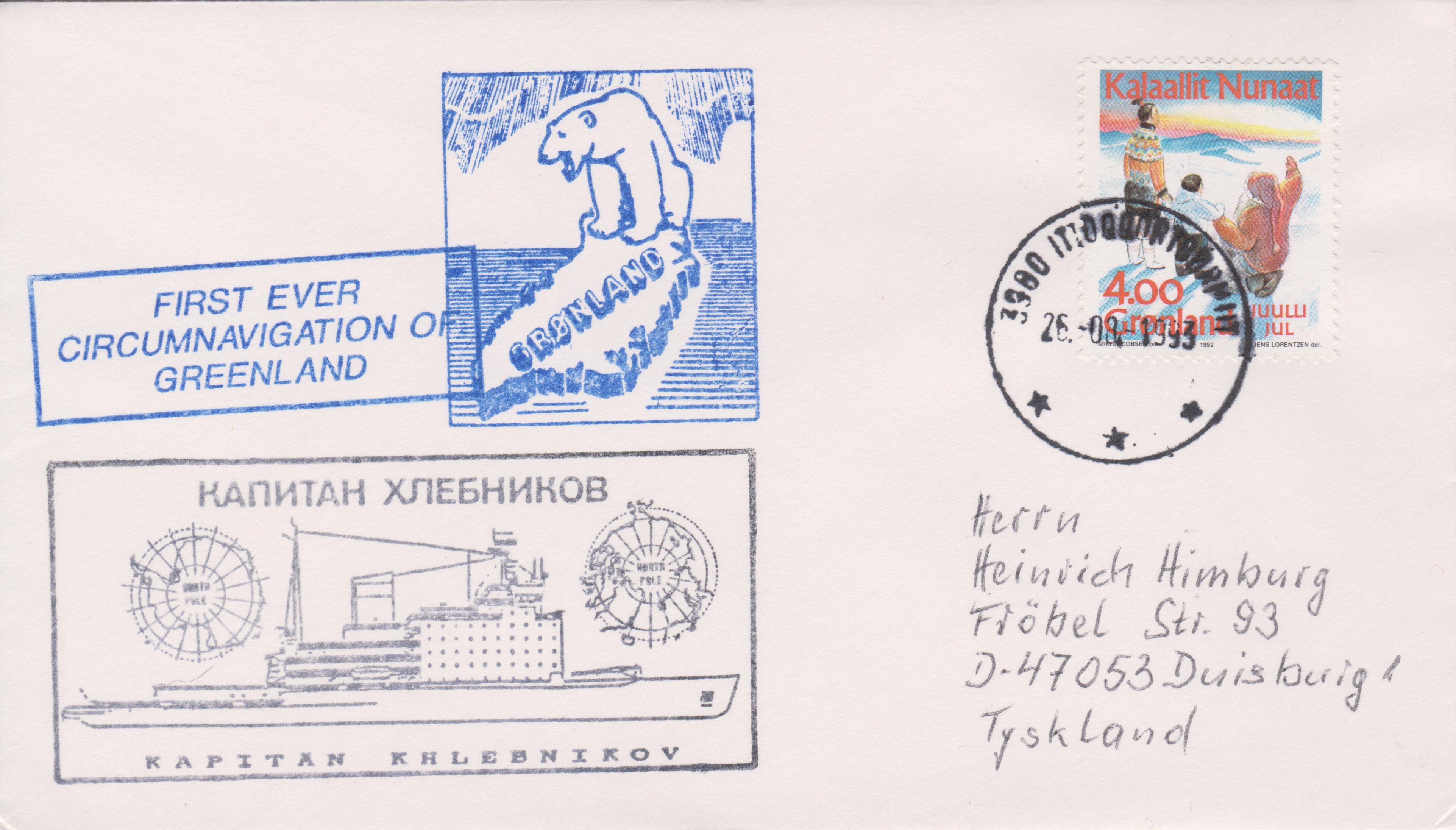Dieser Beleg wurde an Bord der KAPITAN KHLEBNIKOV aufgegeben und dann am 26.08.1993 in Grönland der Post zur Weiterbeförderung nach Deutschland übergeben: