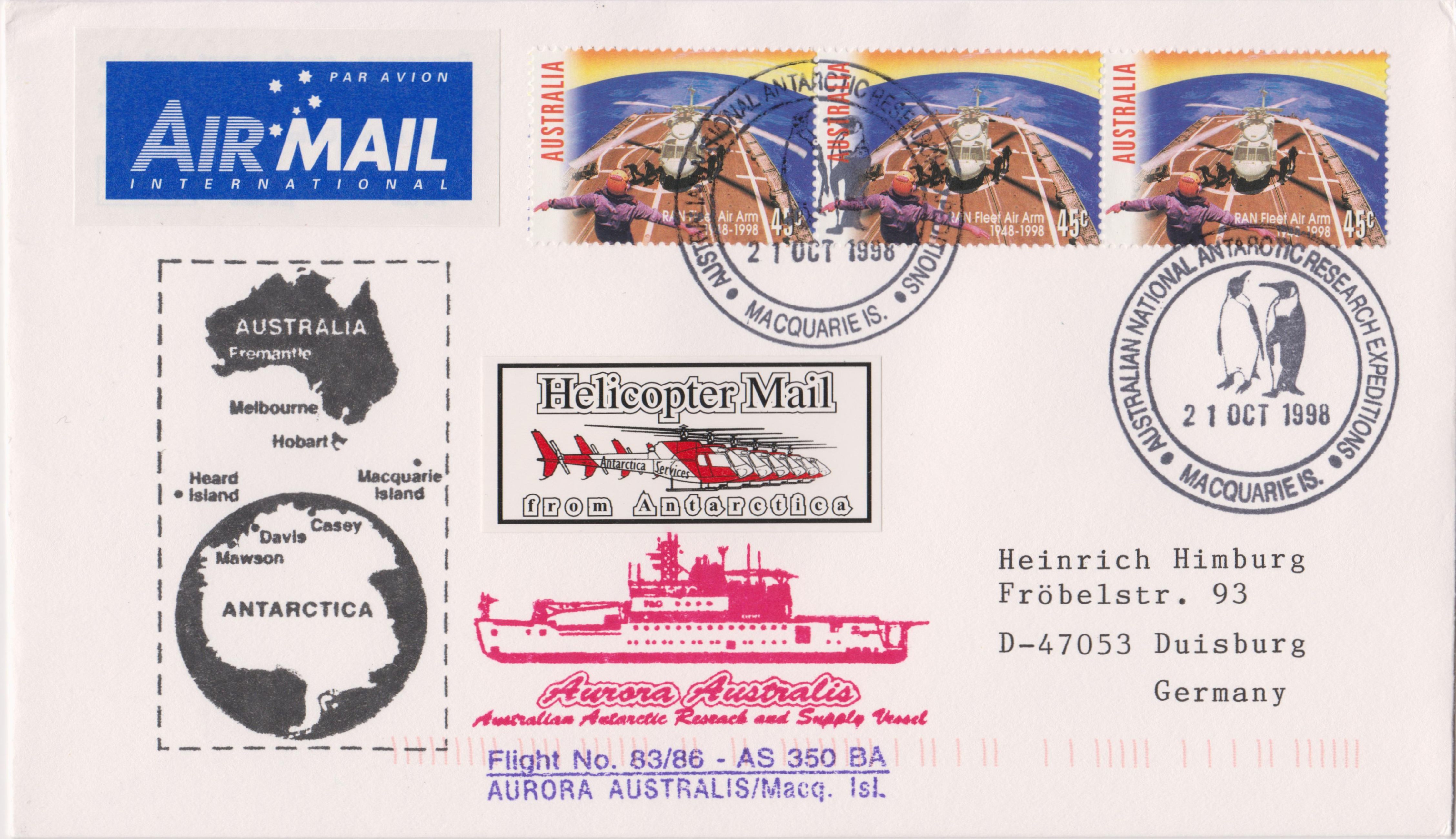 Dieser Beleg wurde am 21.10.1998 mit einem Hubschrauber des Typs AS 350 BA der Aurora Australis befördert: