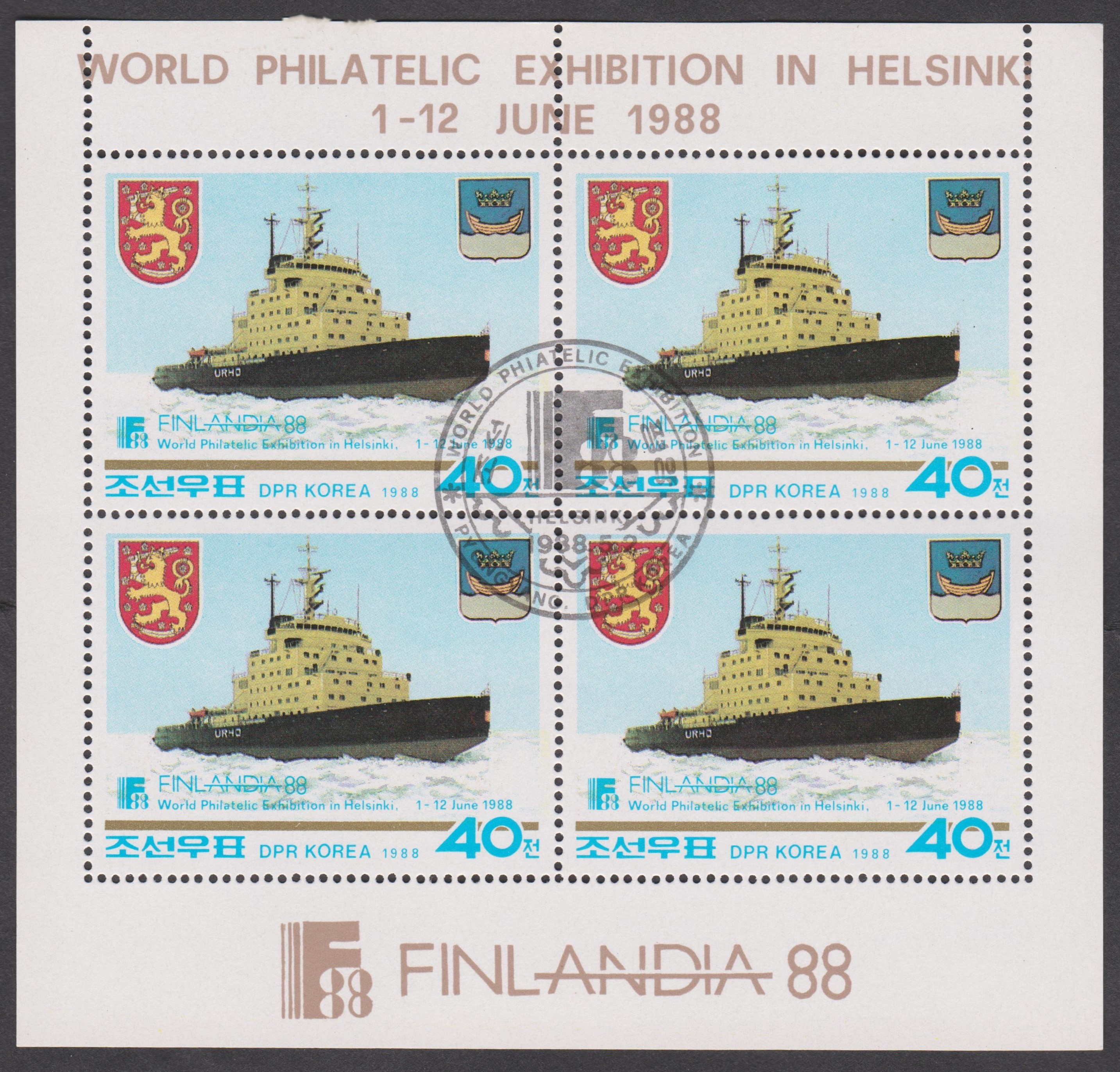 Nordkorea MiNr. 2912 erschien am 02.05.1988 zur internationalen Briefmarkenausstellung FINLANDIA 88, Helsinki im Kleinbogen 2x2 und zeigt den Eisbrecher URHO: