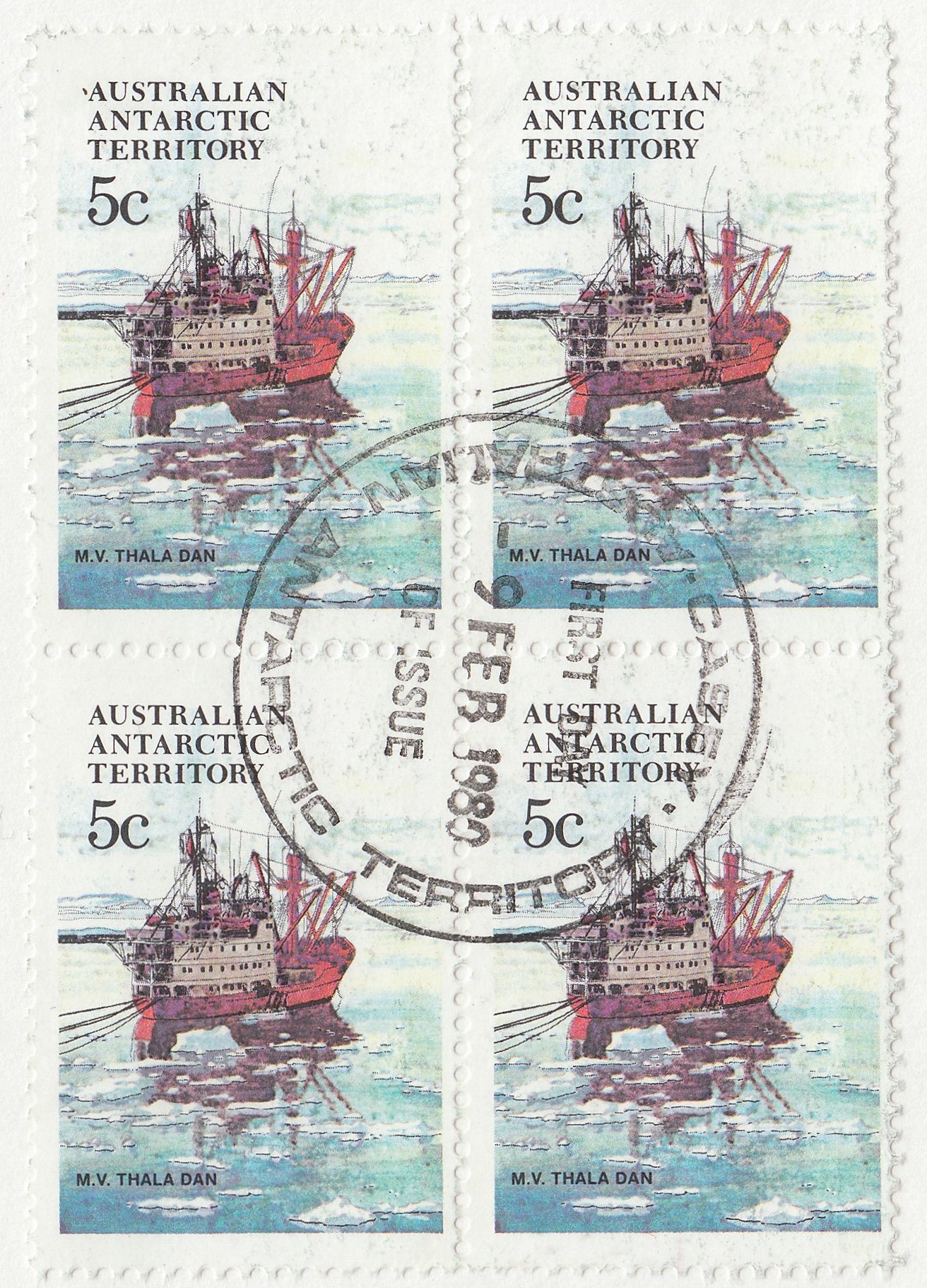 Hier ein Viererblock einer vom AUSTRALIAN ANTARCTIC TERRITORY ausgegebenen Briefmarke mit der Abbildung dieses Schiffes:
