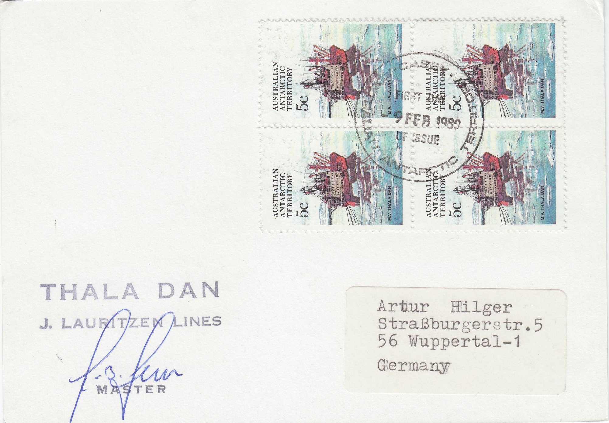 Der Viererblock dient als Frankatur auf dieser Postkarte mit Signatur des Kapitäns der MV THALA DAN: