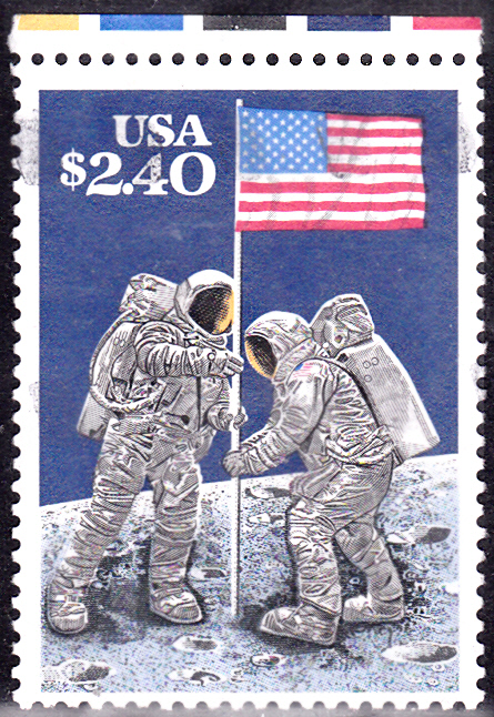 Zum 20. Jahrestag der ersten bemannten Mondlandung erschien in den USA diese Marke (MiNr 2045) mit den Astronauten Neil Armstrong (1930-2012) und Edwin Aldrin (*1930) beim Hissen amerikanischer Flagge auf dem Mond.