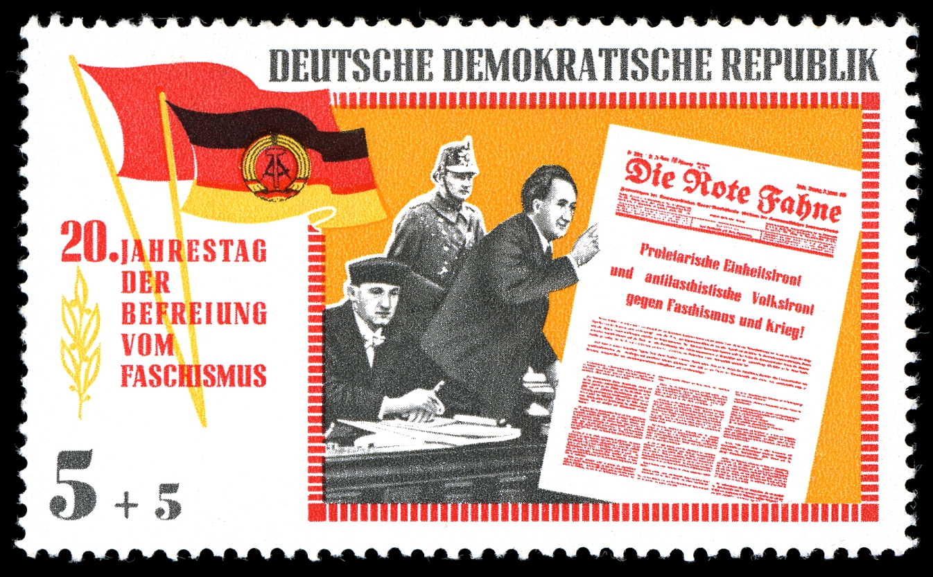 Zum 20. Jahrestag der Befreiung vom Faschismus erschien 1965 in der DDR dieses Postwertzeichen, MiNr. 1102, das Georgi Dimitroff vor dem Reichsgericht in Leipzig sowie ein Titelblatt der "Roten Fahne" zeigt: