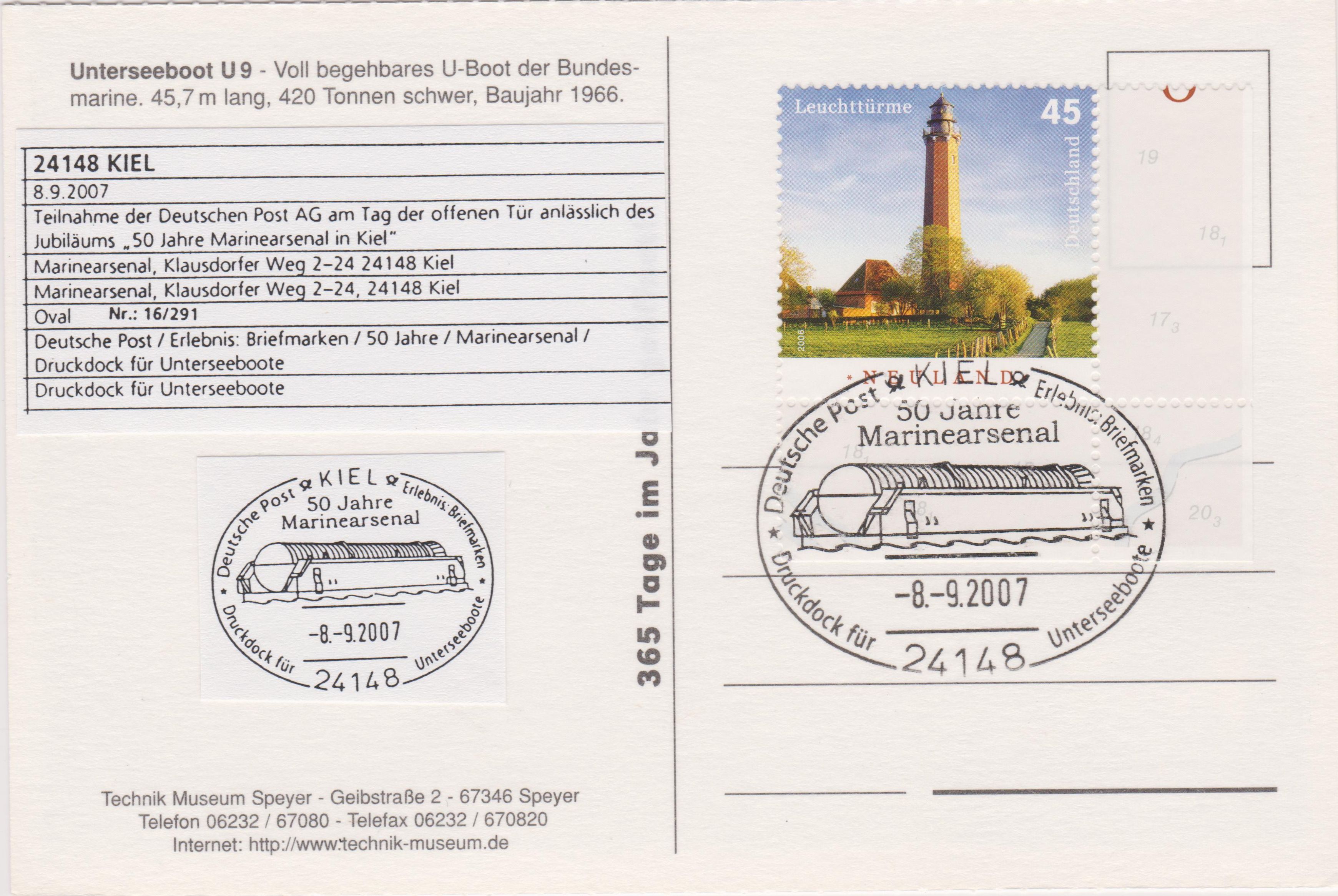 Am 08.09.2007 legte die Deutsche Post AG am Tag der offenen Tür anlässlich des Jubiläums "50 Jahre Marinearsenal in Kiel" diesen Sonderstempel mit dem Dock C als Motiv auf: