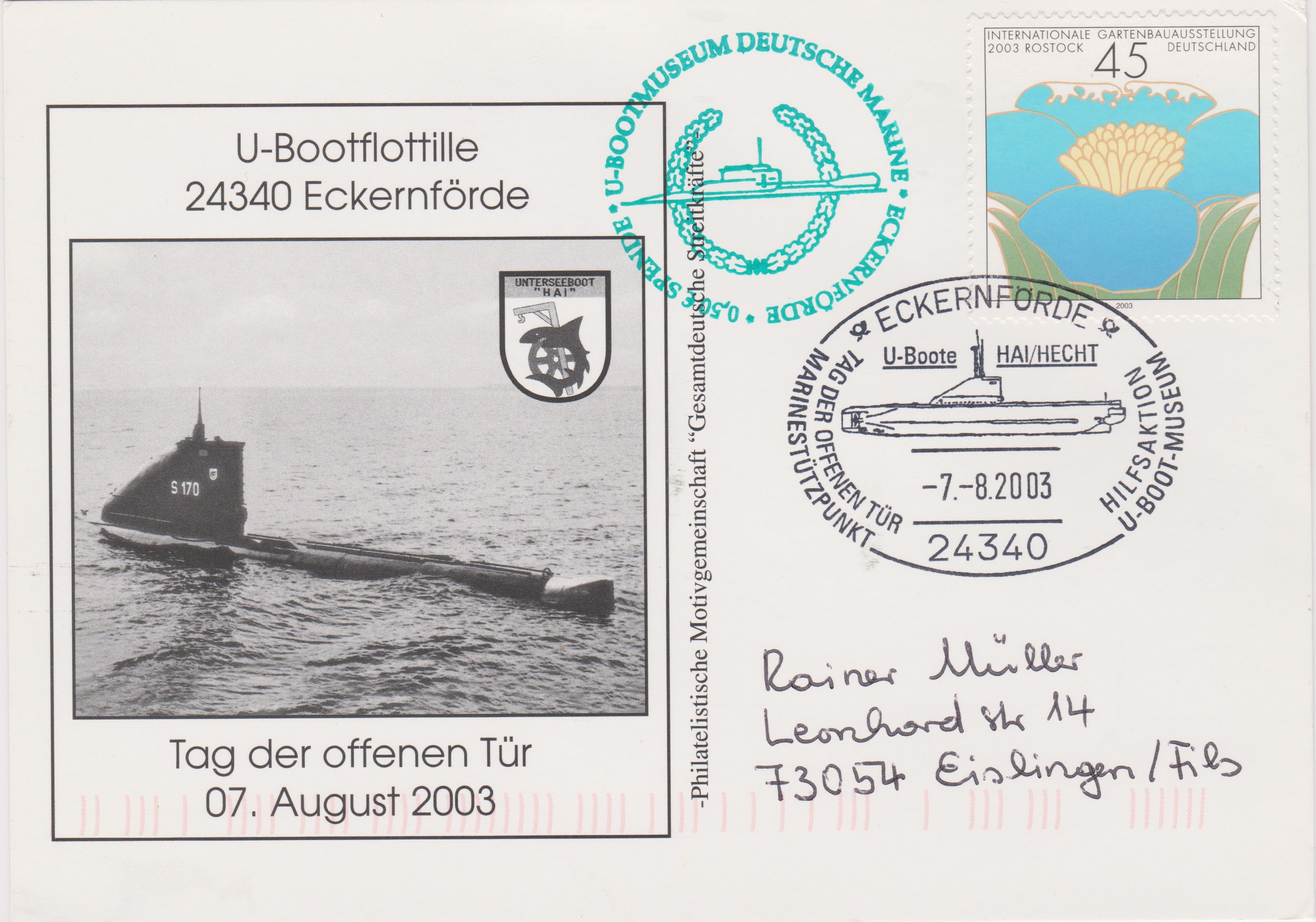 Hier ein Beleg mit Sonderstempel vom 07.08.2003 zum Gedenken an die U-Boote HAI sowie HECHT: