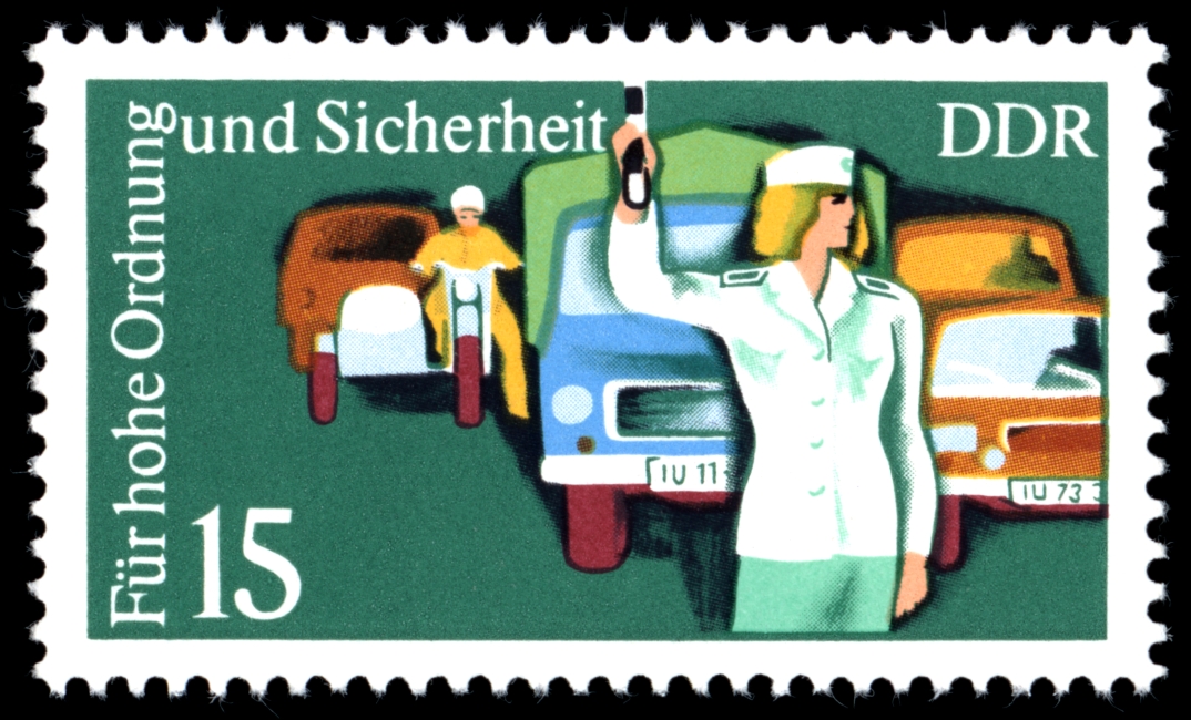 Eine Polizistin regelt in der DDR den Verkehr... und schon staut sich der Verkehr!