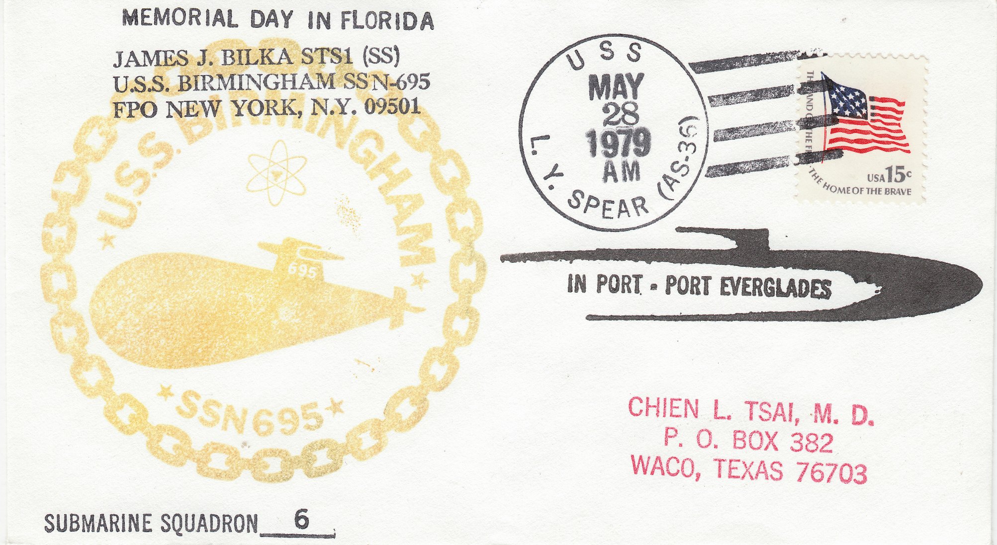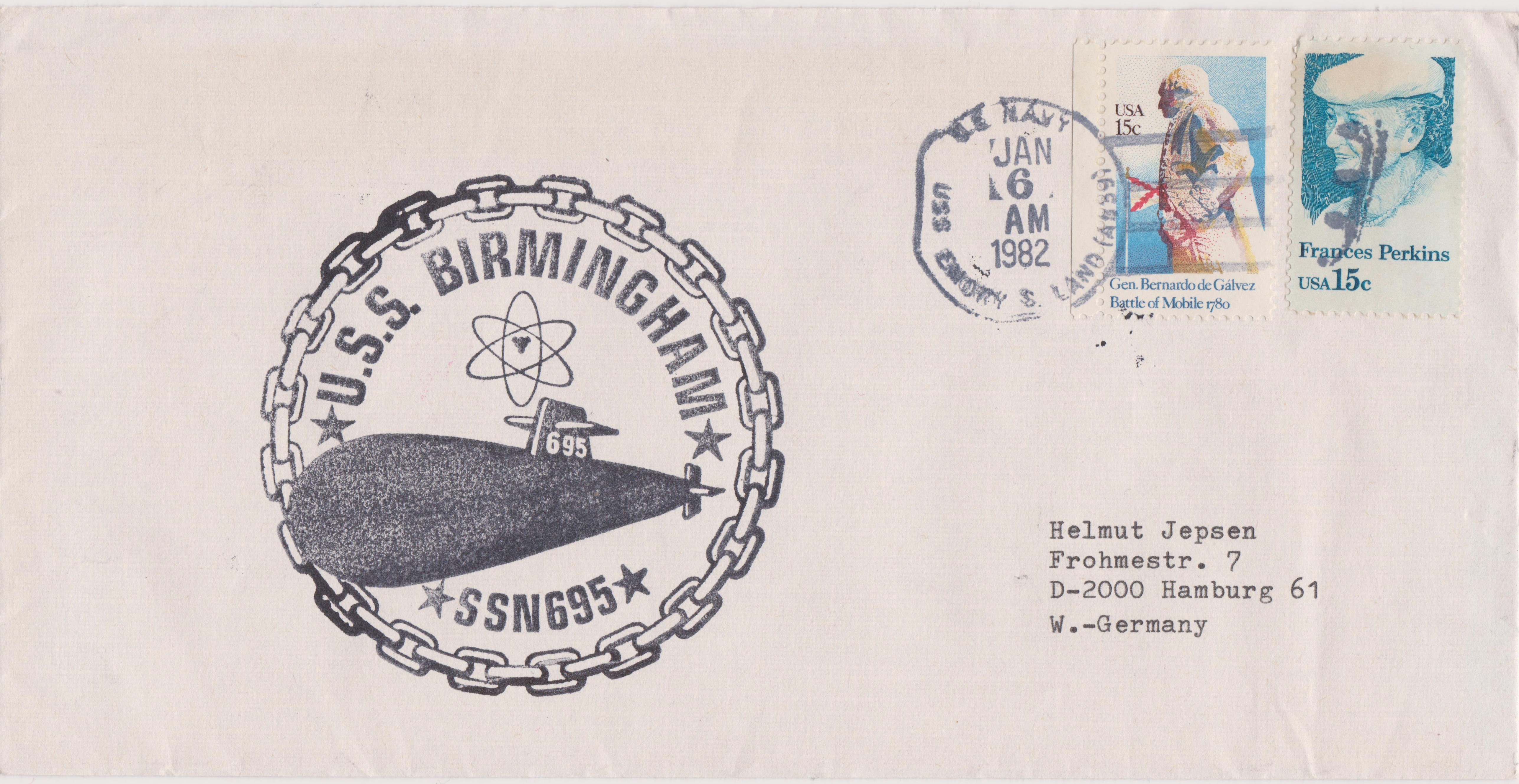 Absender ist James J. Bilka STS1 (SS) = "Sonar Technician(Submarines) First Class (Submersible Ships)", der vom 01.07.1977 bis zum 15.01.1980 auf der USS BIRMINGHAM fuhr.