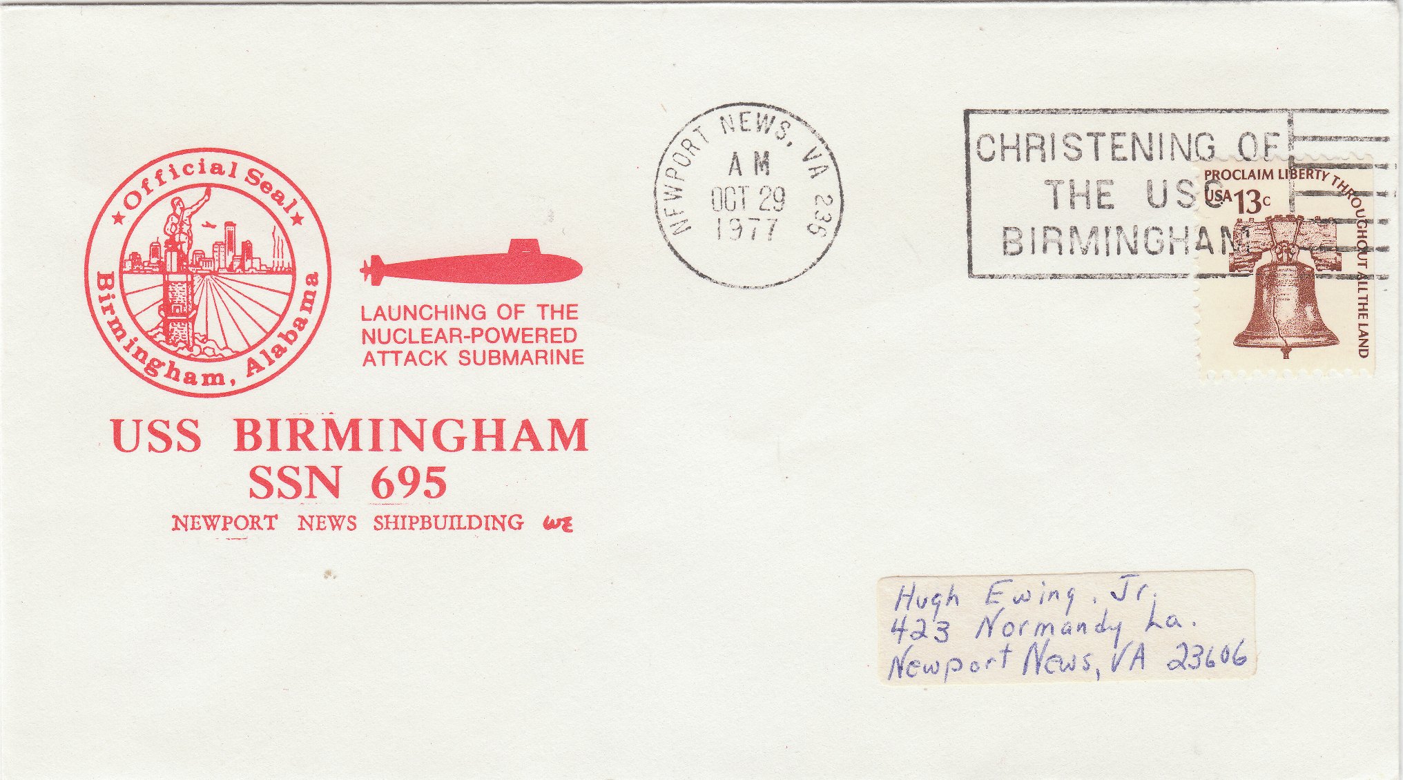 Dieser Beleg dokumentiert den Stapellauf der USS BIRMINGHAM (SSN-695), der am 29.10.1977 stattfand: